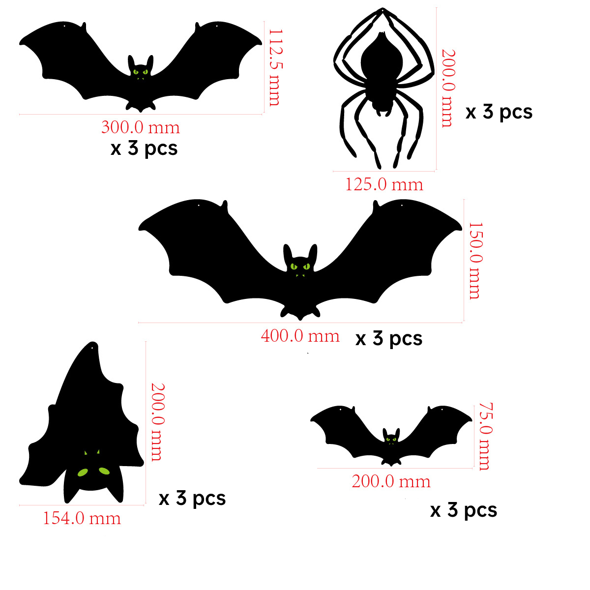 Lieferumfang: Insgesamt 15 Fledermaus-Dekorationen in 5 Stilen.