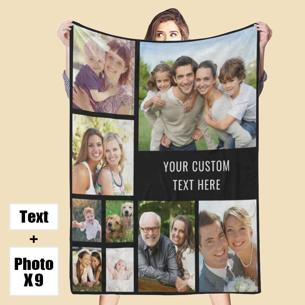 Benutzerdefinierte 9 Fotos Text schwarze Fleecedecke Geschenk für Sie/Ihn