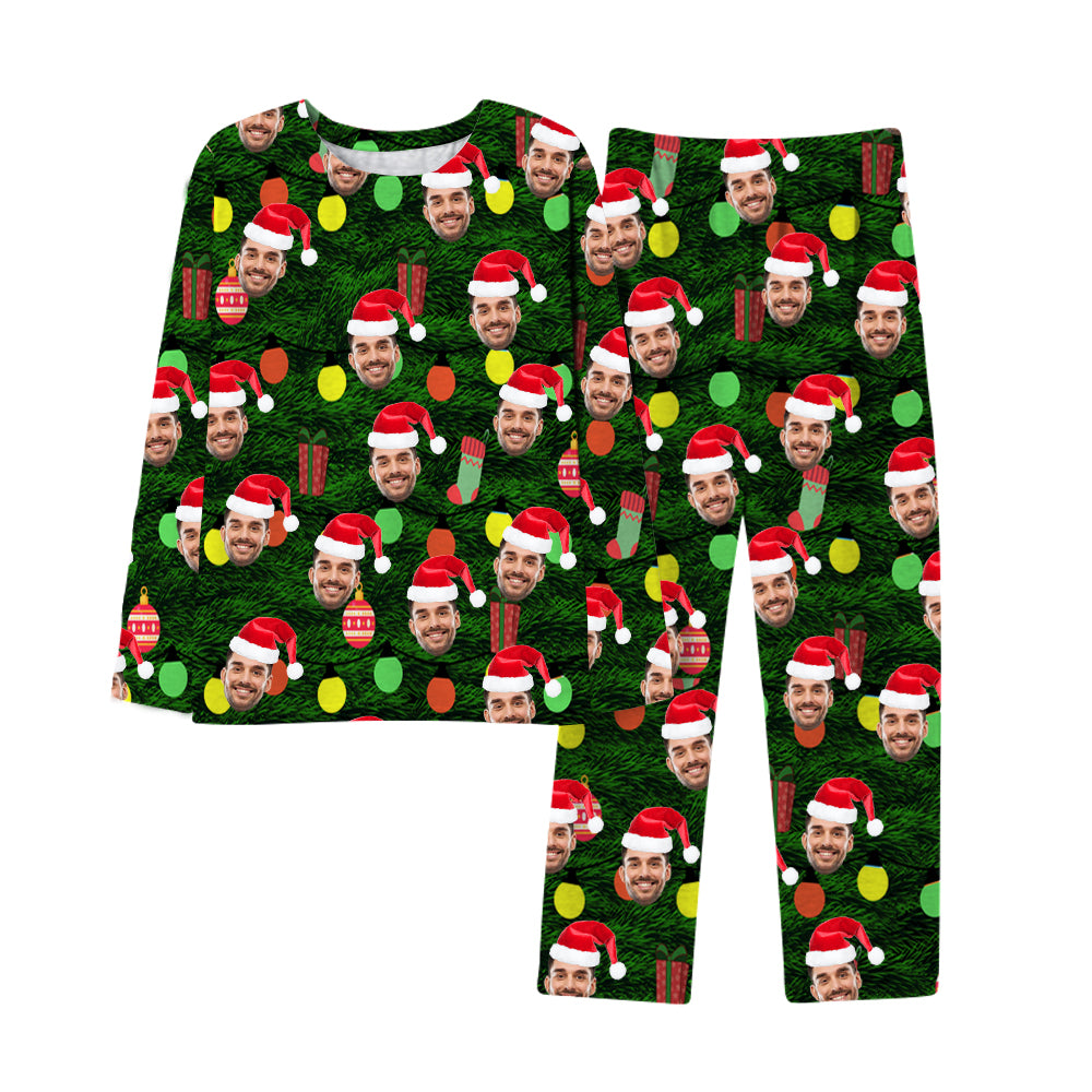 Custom Face Pajamas Green Sleepwear For Couple With Christmas Hat