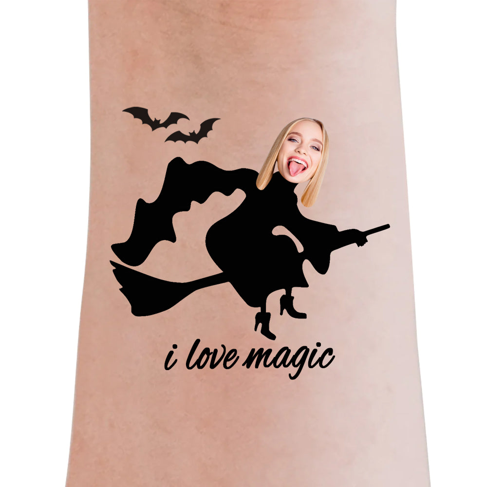 Halloween-Tattoo-Aufkleber, individueller fliegender Hexen-Avatar, ich LIEBE MAGIE
