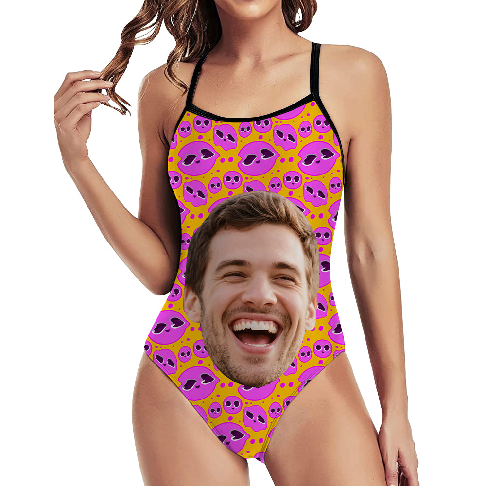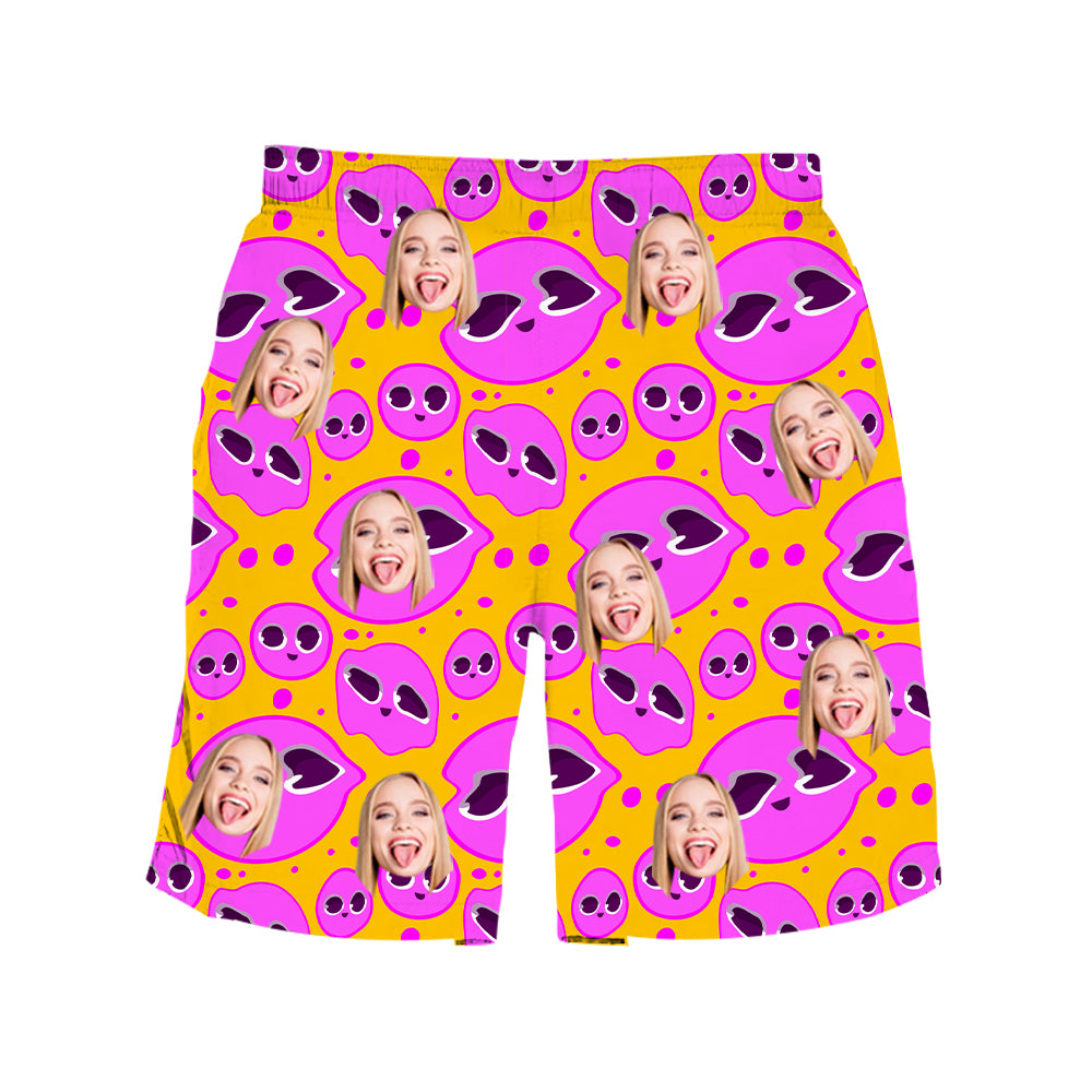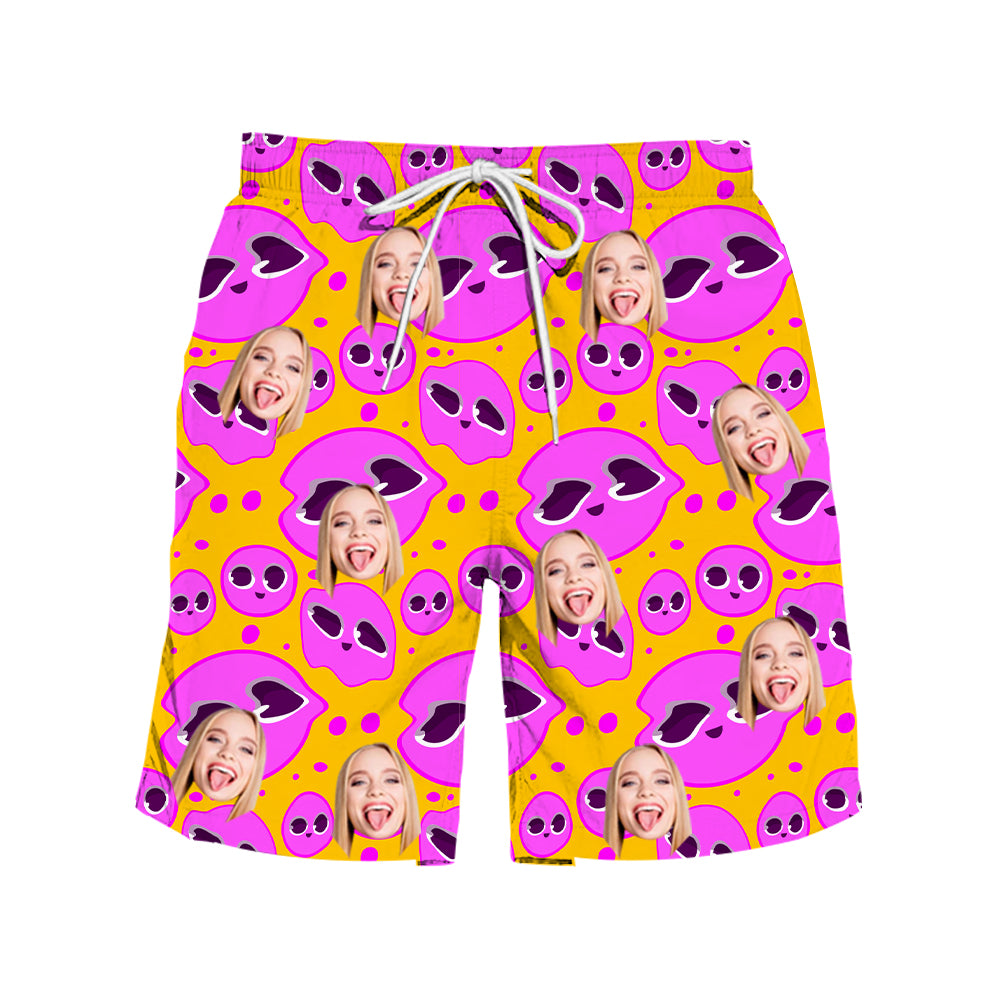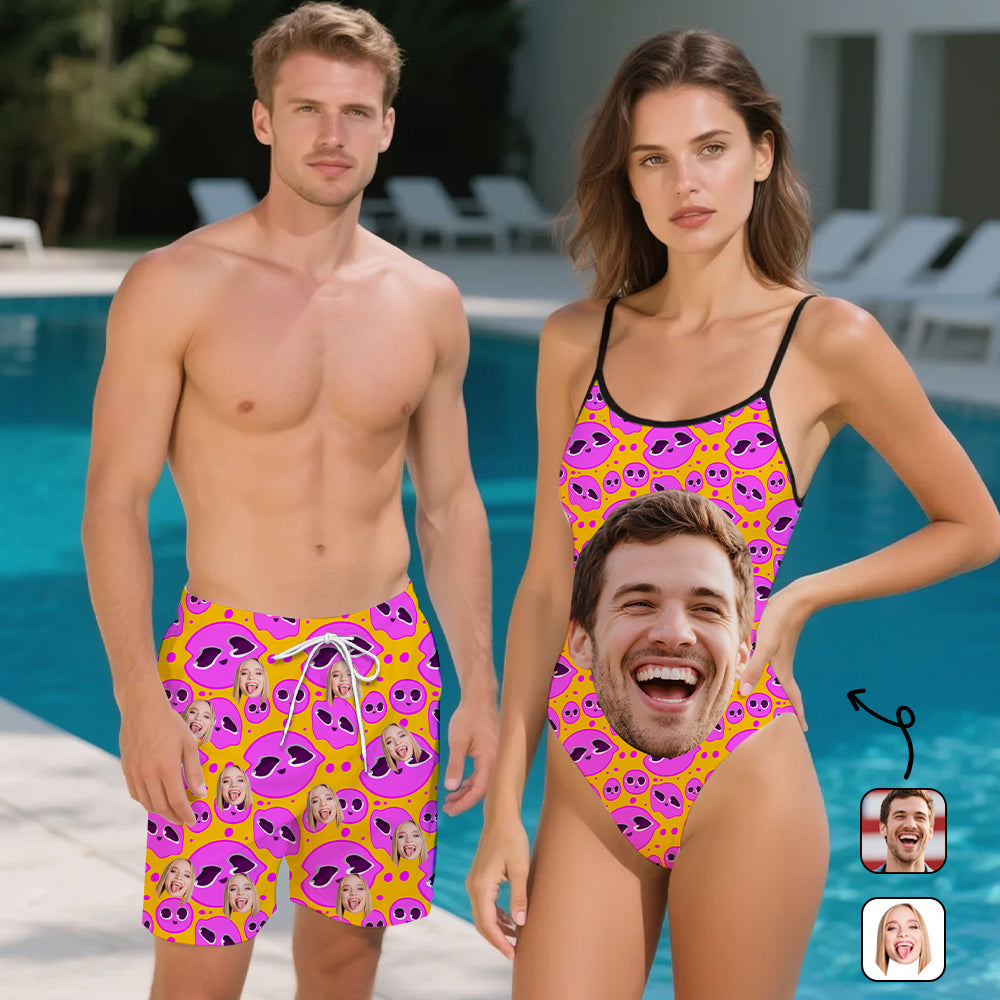 (Tax Included) Custom Face Couple's Pink Emoji Swim Trunks & Bikini Set For Playful Summer Getaways