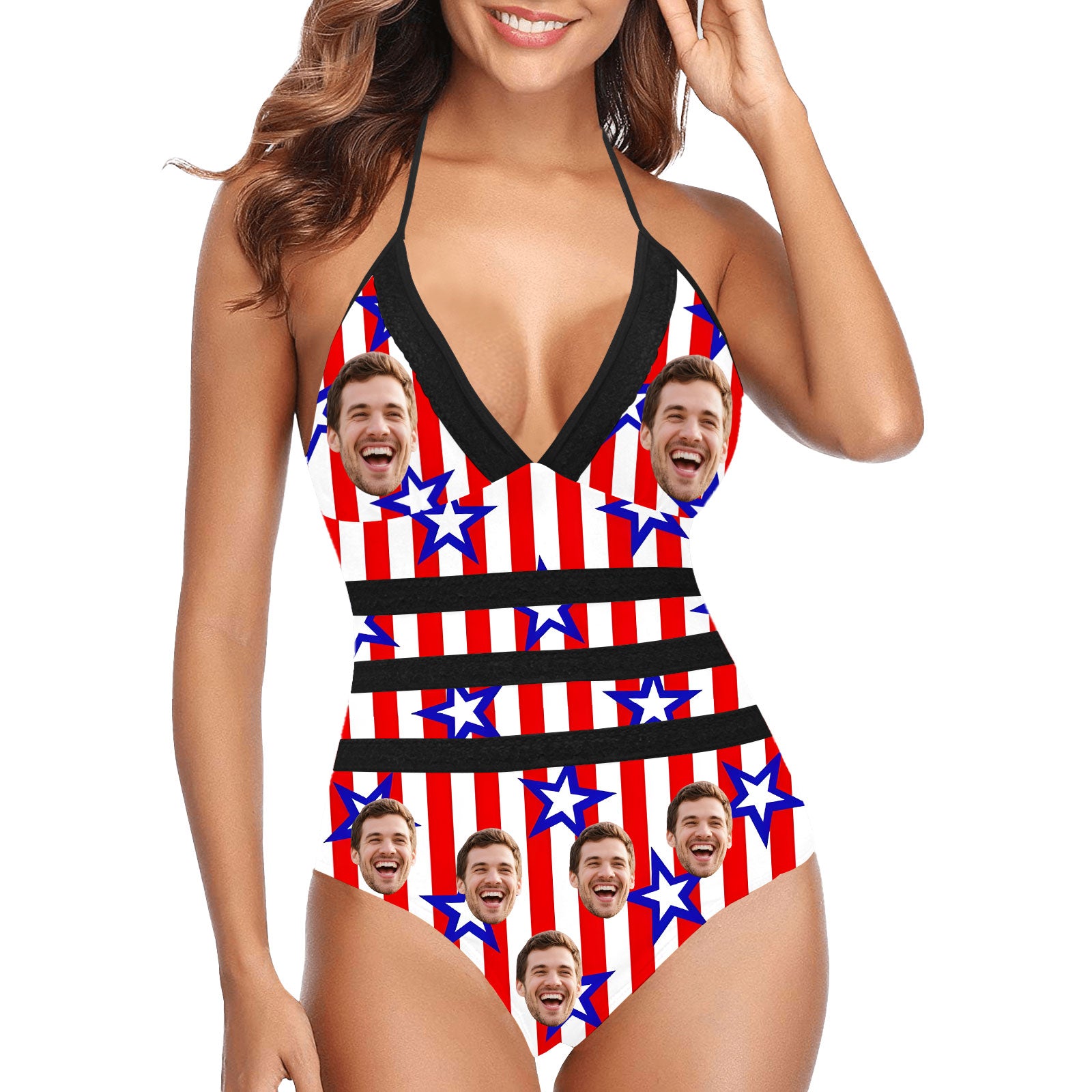 (Tax Included) Custom Face Red & White Stripe Swimsuit - Navy Star Portrait Style