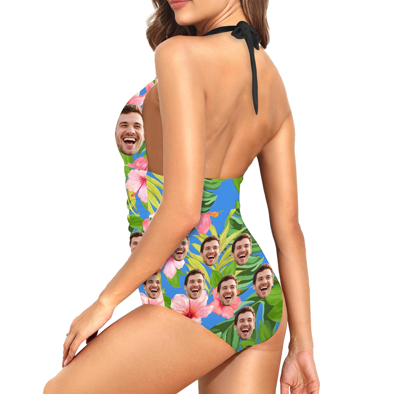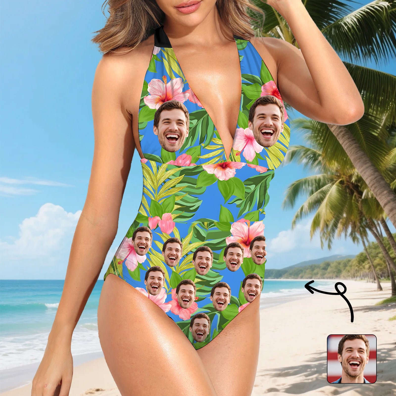 (Tax Included) Vacation Style Blue Floral Swimsuit With Custom Face Portrait
