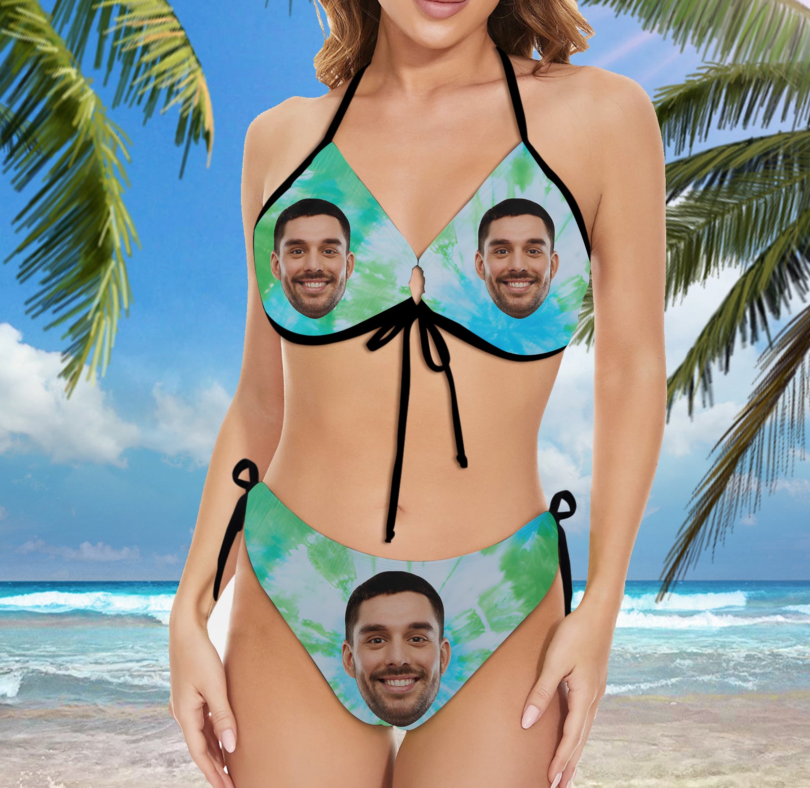 (Tax Included) Personalized Women Halter Neck Bikini Two Piece Set Custom Face Photo Swimsuit Drawstring Adjustable Bikini Valentine's Day Gift for Women