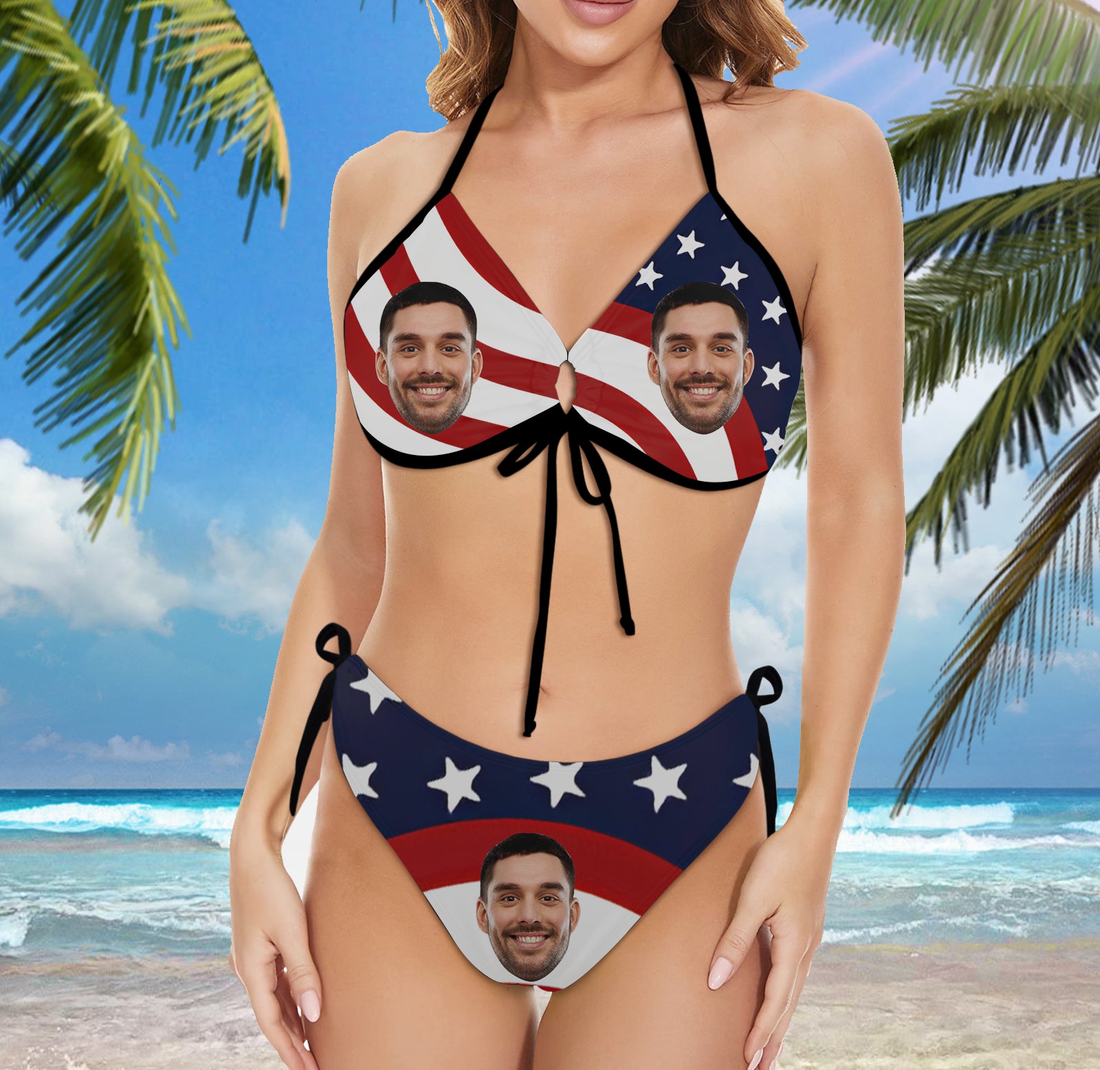 (Tax Included) Personalized Boyfriend Face Photo Women's Swimsuit Bikini Two-piece Drawstring Adjustable Bathing Suit American Independence Day