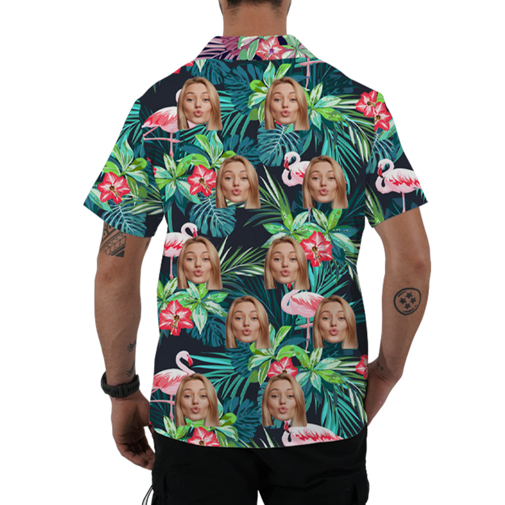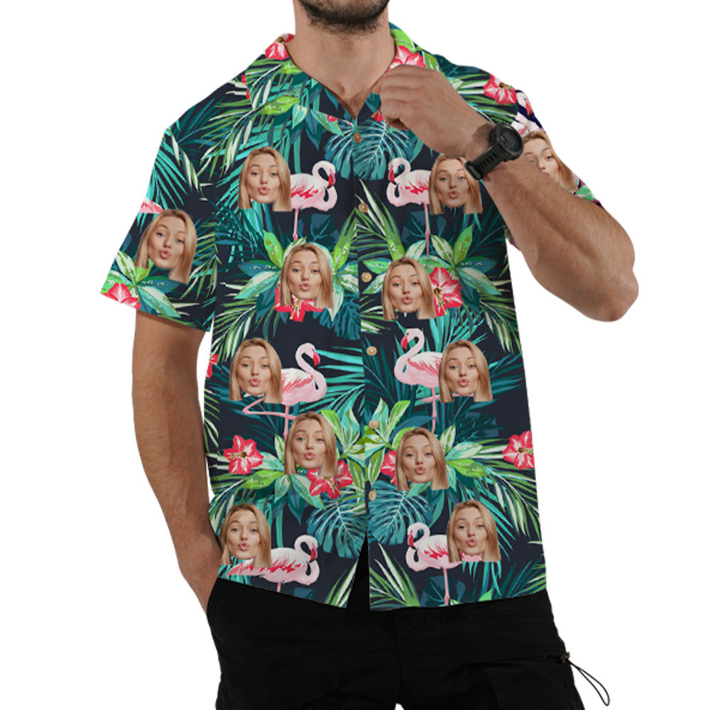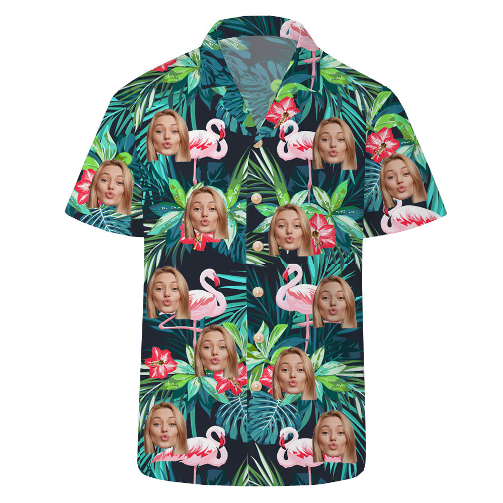 Green Leaves Flamingo Print Hawaiian Shirt Customized Face Lapel Shirt Vacation Wear