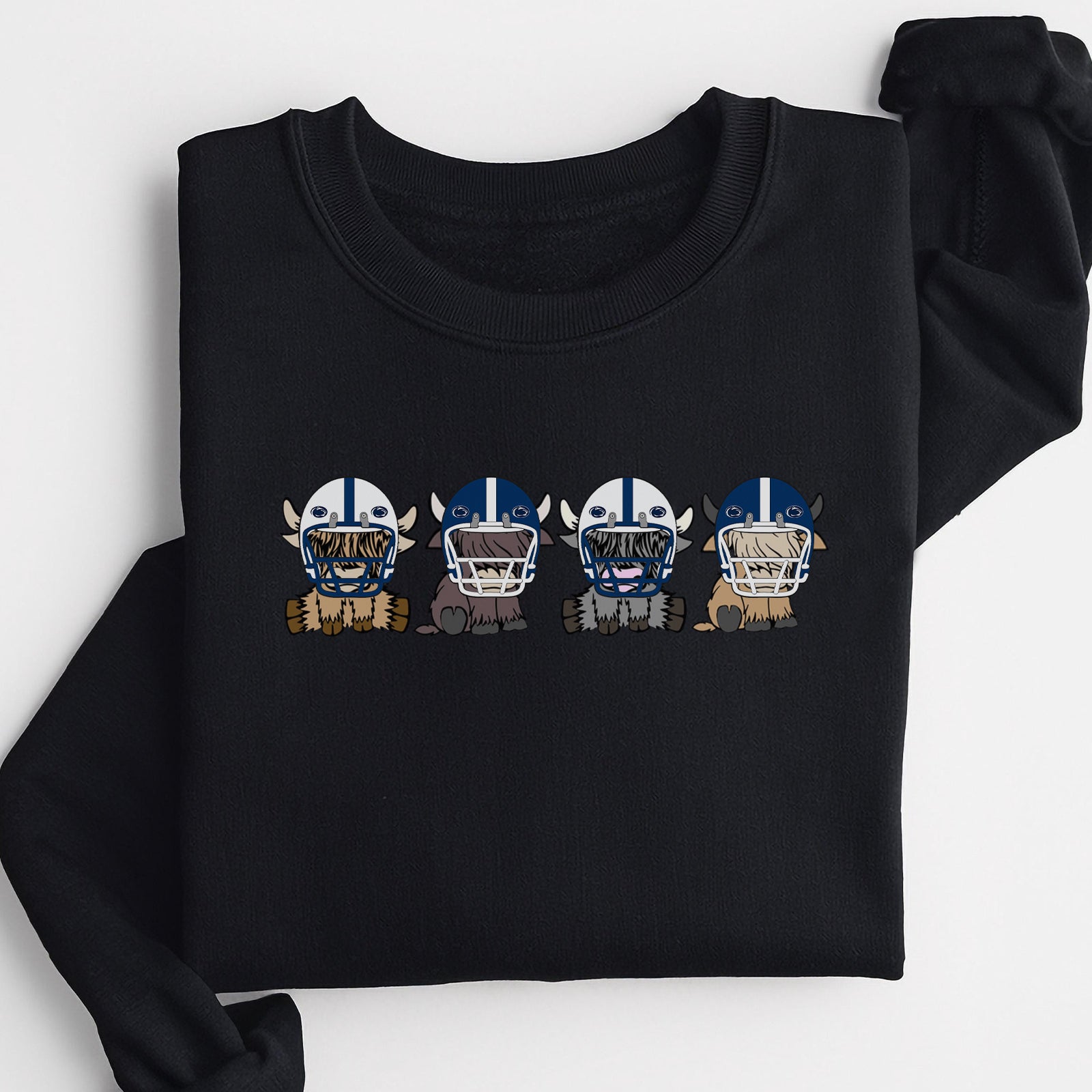 Cheer on your favorite team with our adorable Highland Cow Football Team Sweatshirt! Featuring charming Highland cows each sporting different American football team hats, this sweatshirt lets you pick your preferred team and show your support in style.