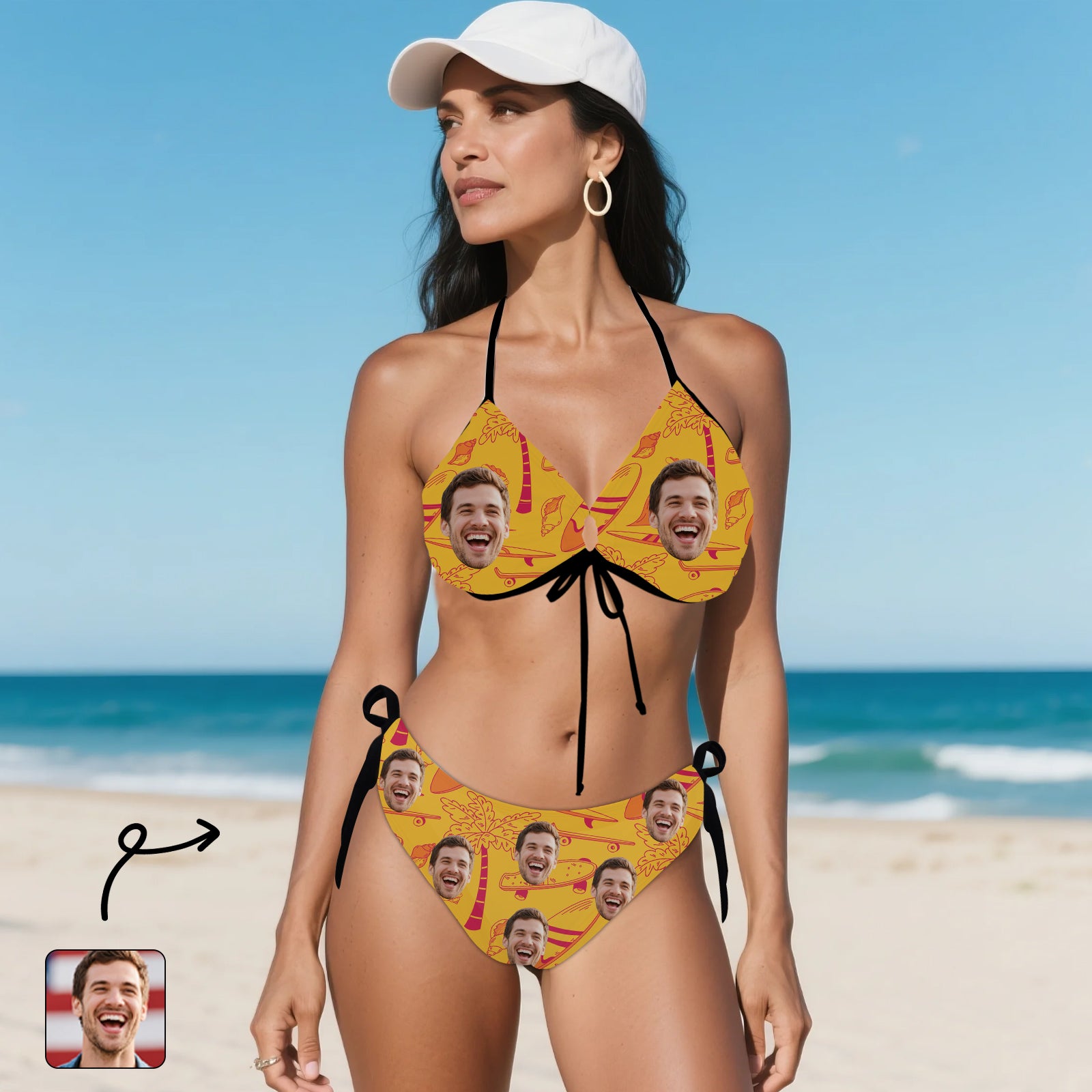 (Tax Included) Cool Custom Face Bikini Set With Coconut Trees & Surfboards For Summer Adventures