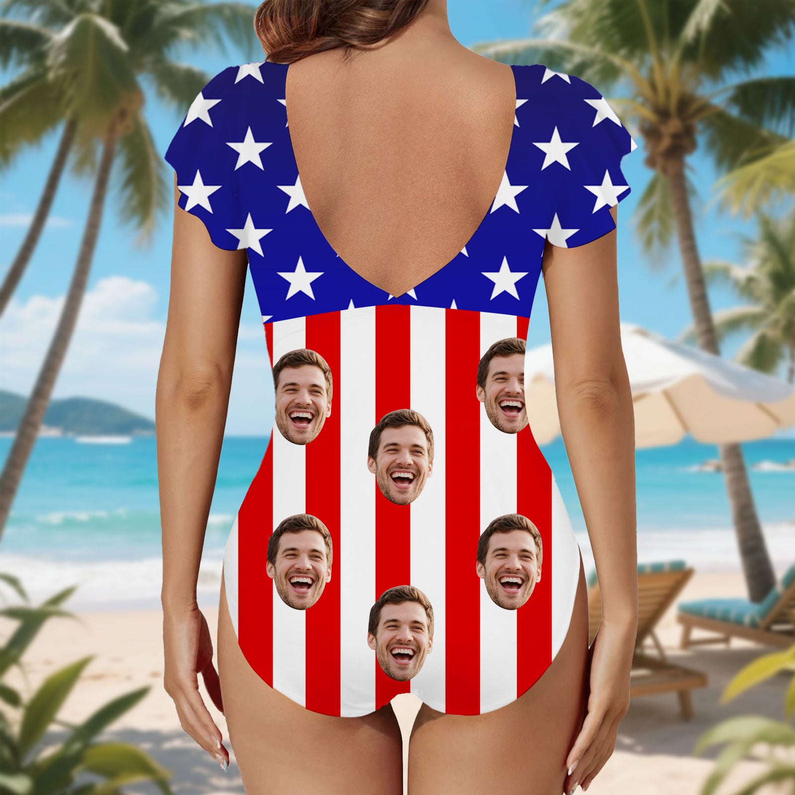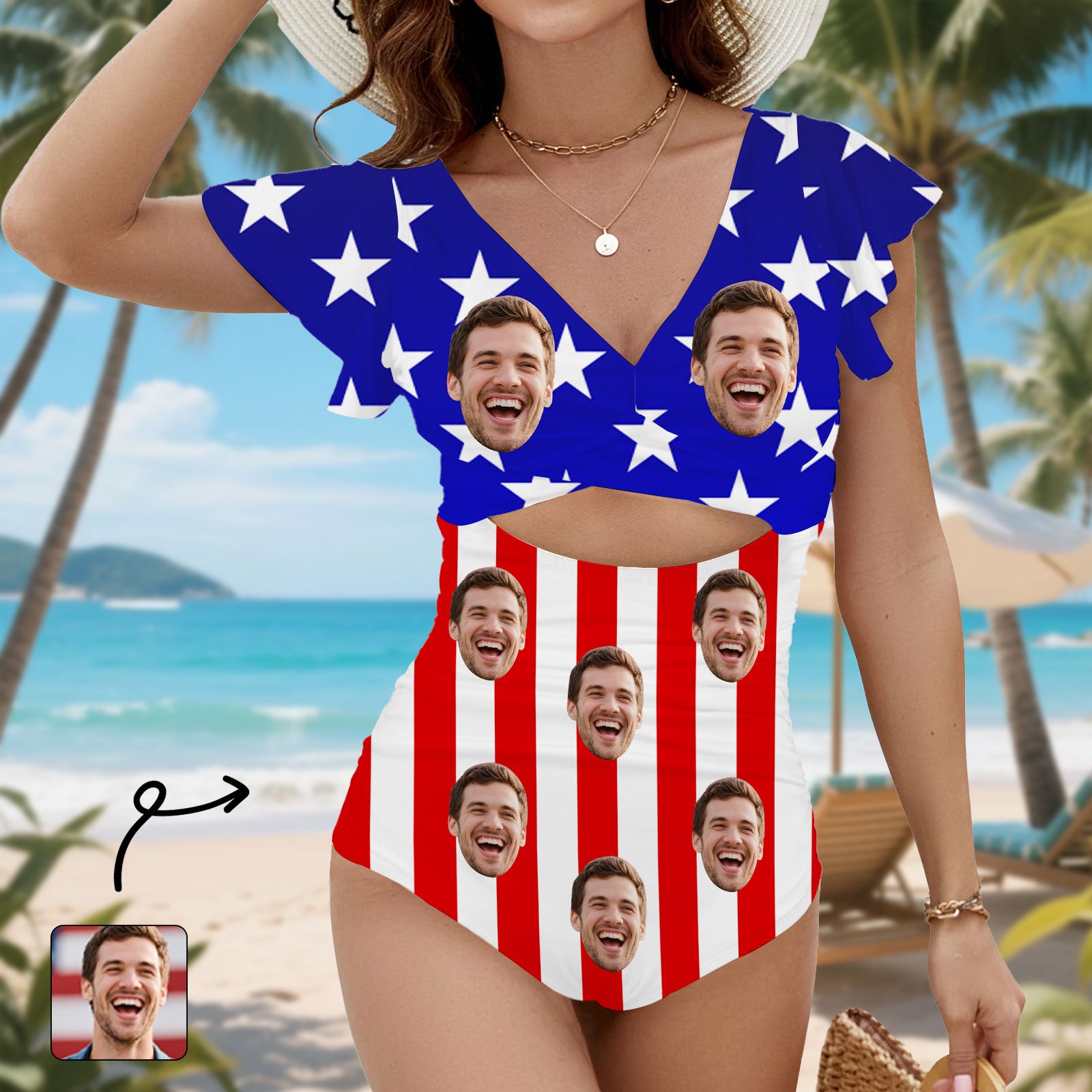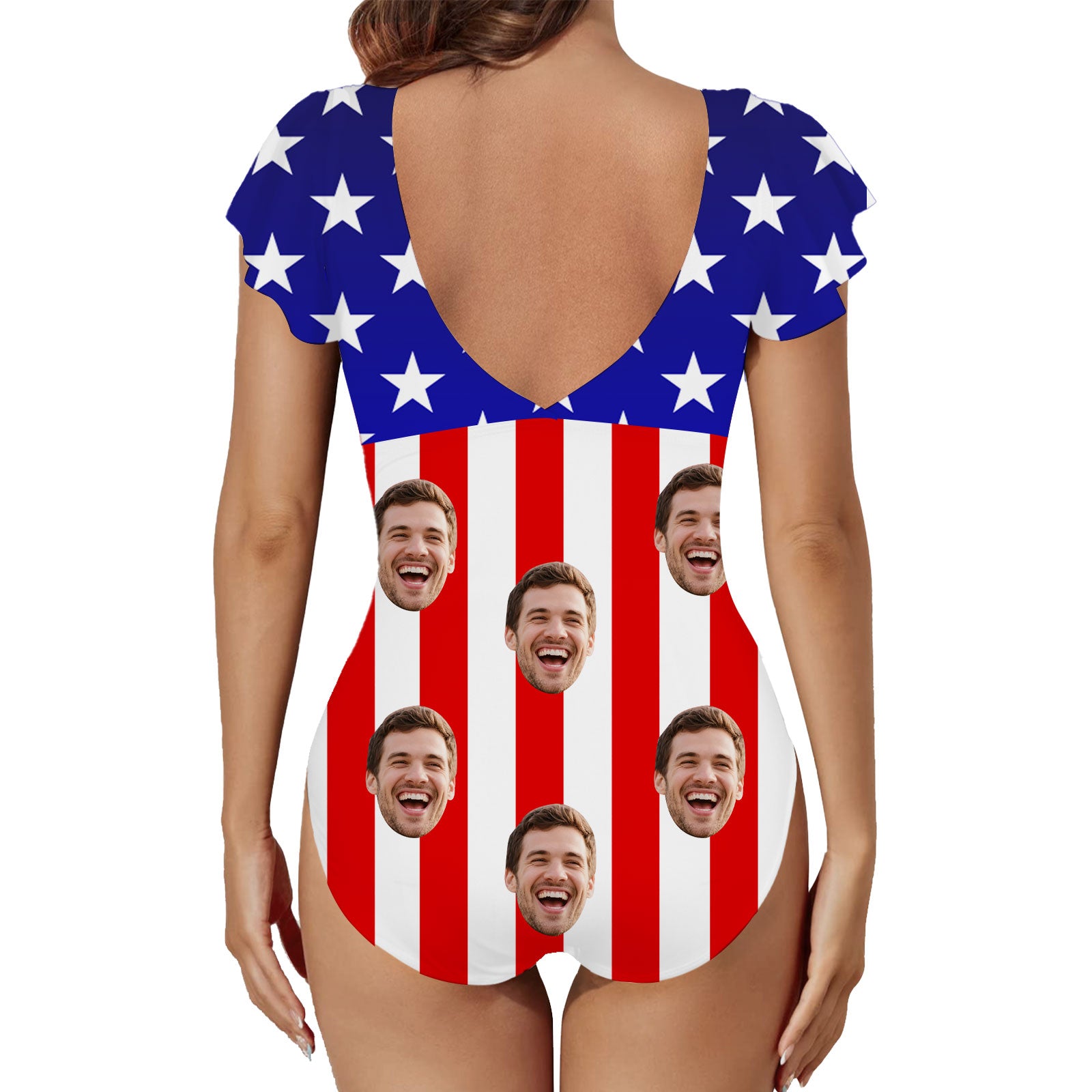 (Tax Included) Custom Face American Flag Swimsuit - Patriotic Stars & Stripes Design