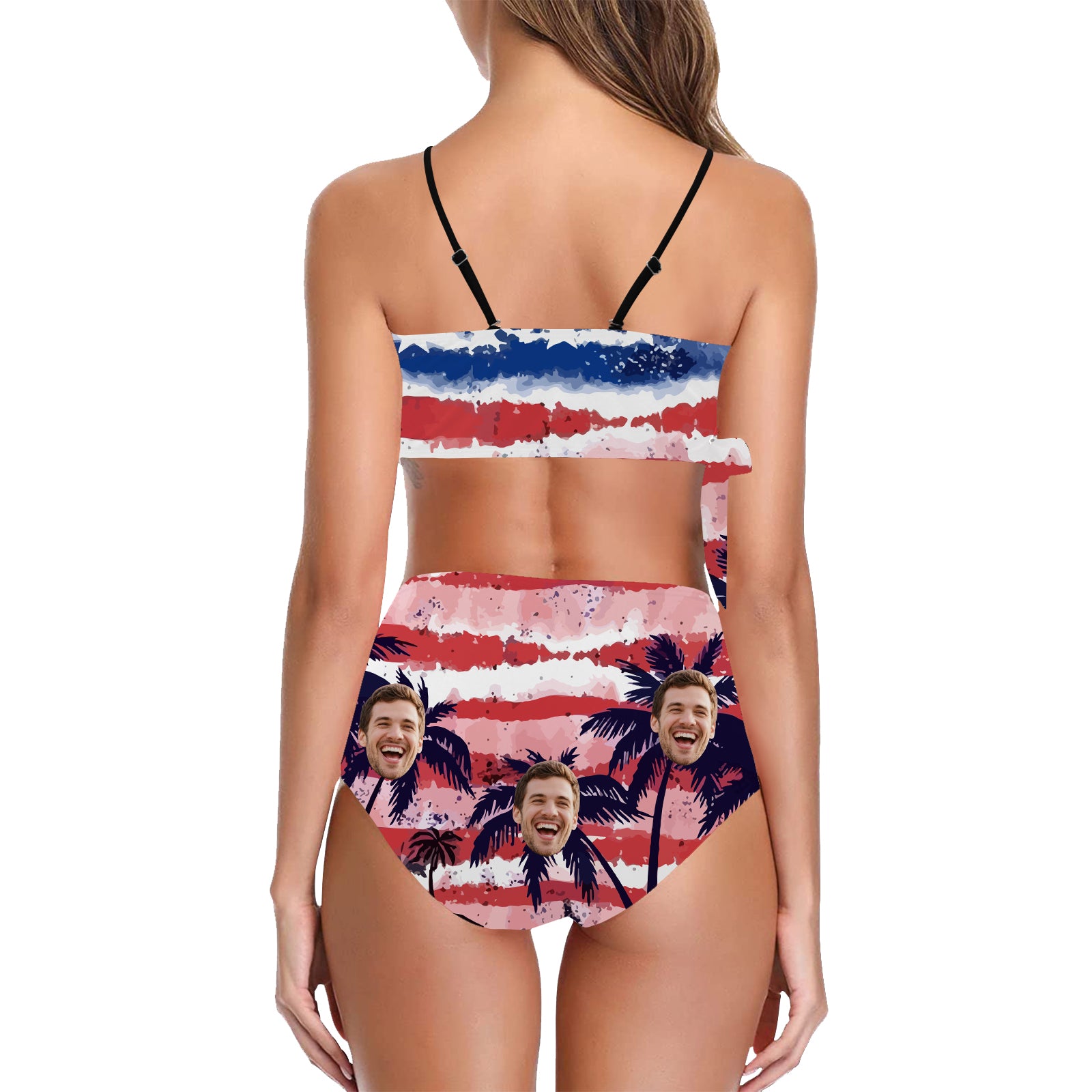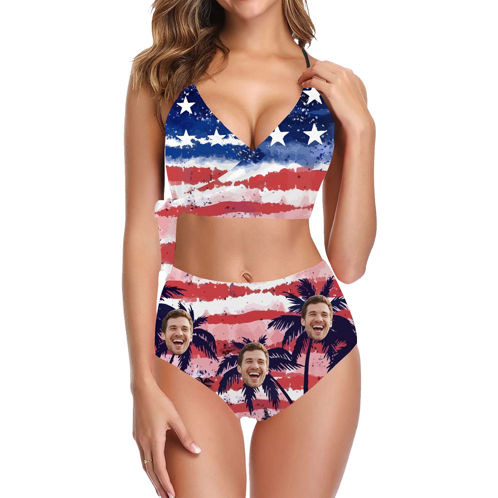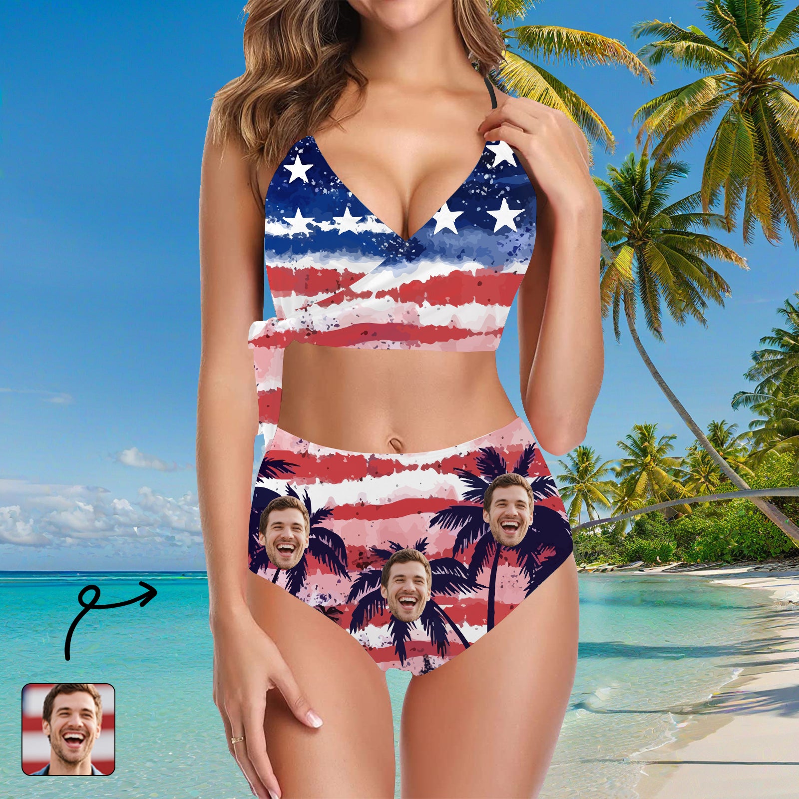(Tax Included) Custom Face American Flag & Tropical Palm Tree Swimwear With Personalized Photo Print Design