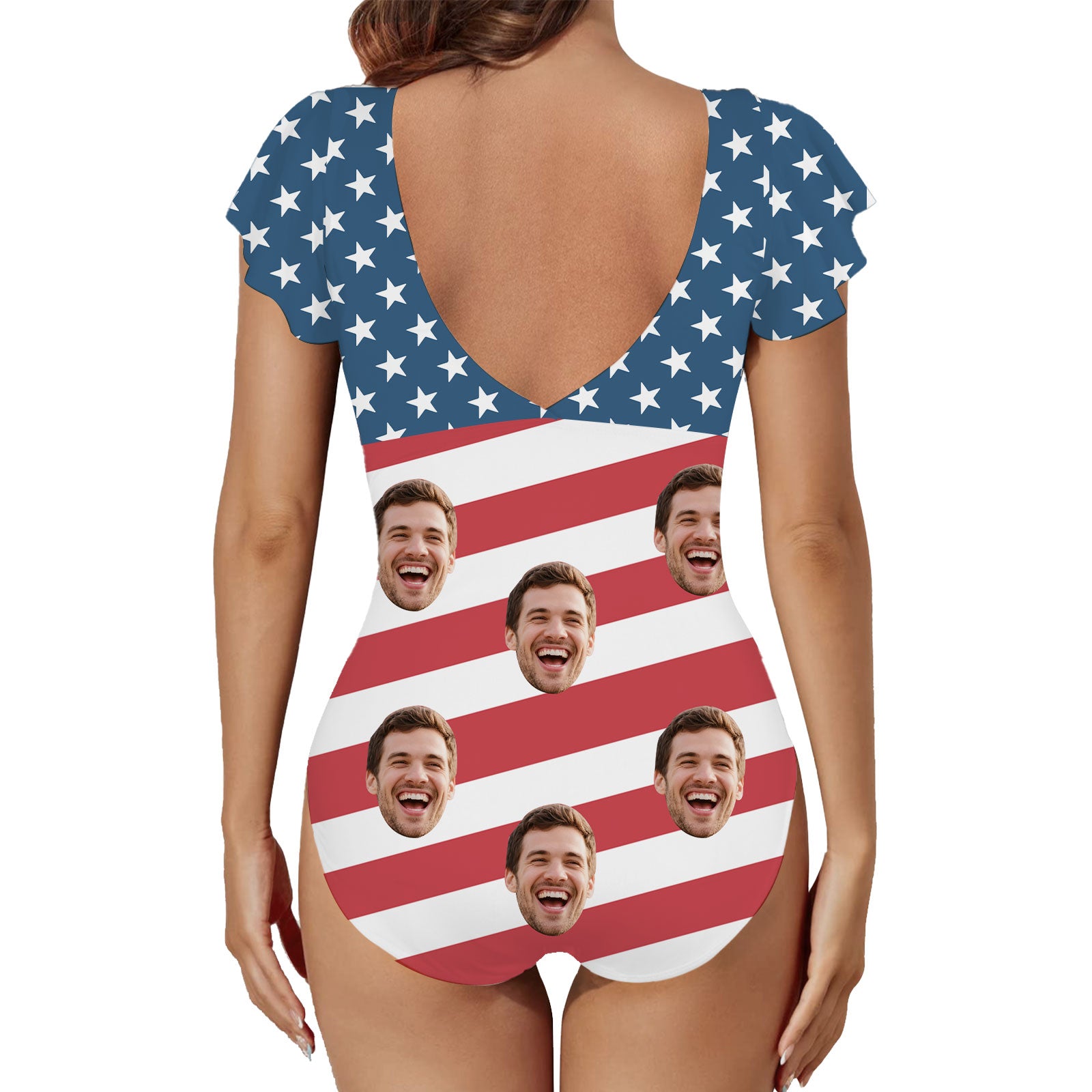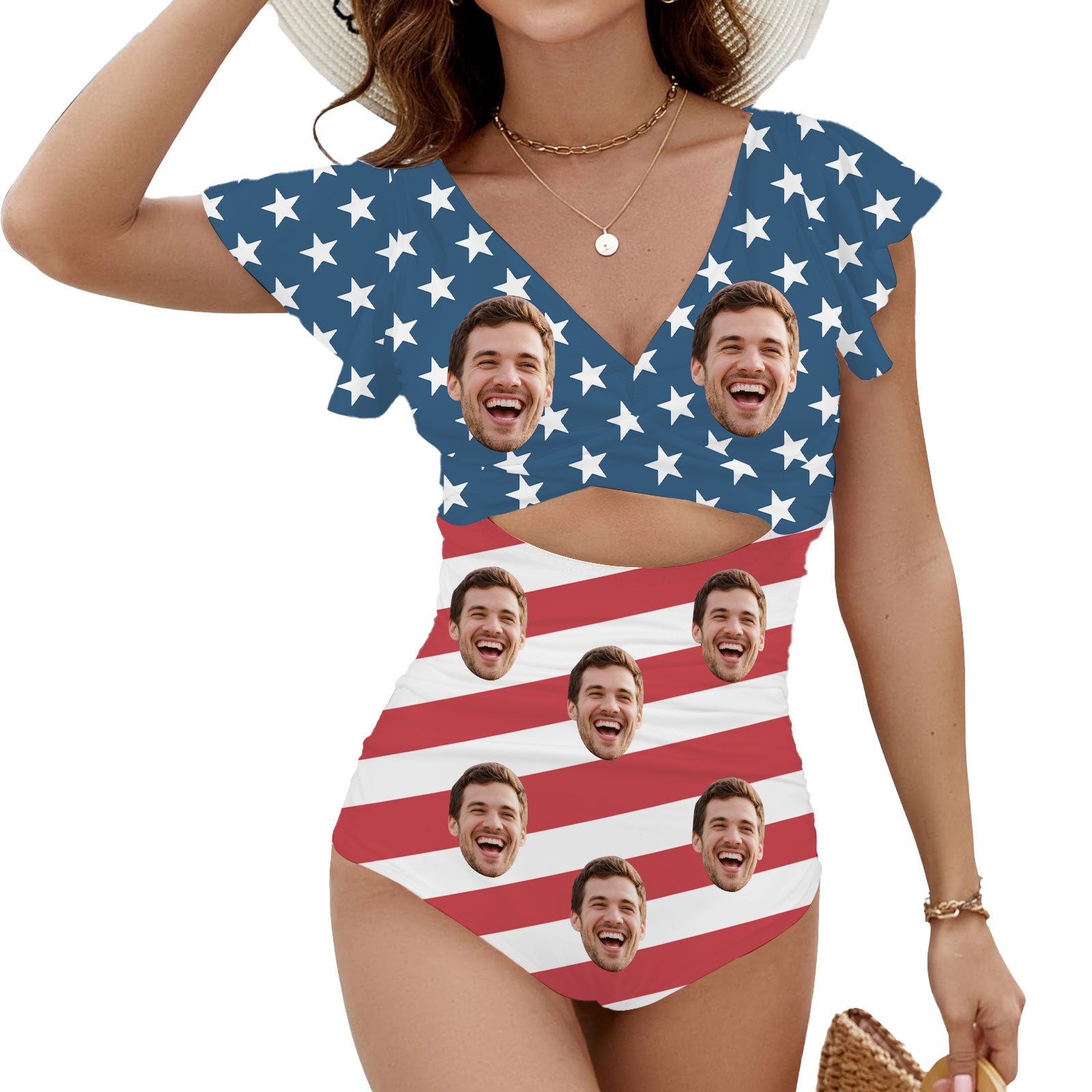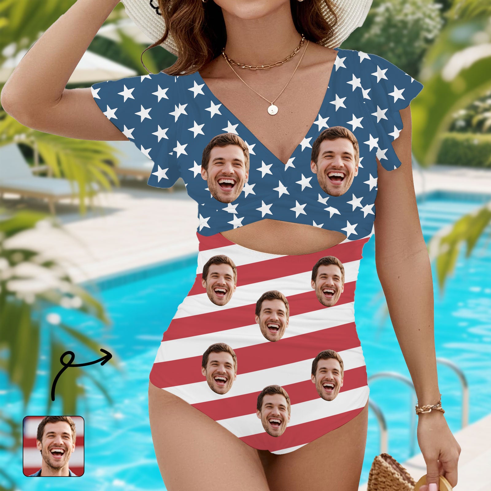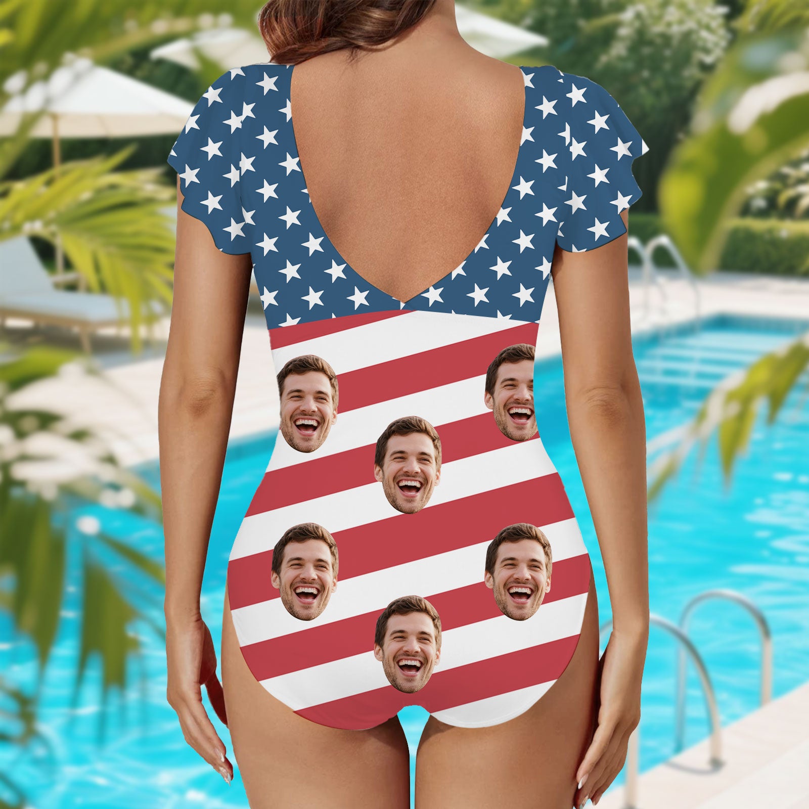 (Tax Included) Custom Face Blue Poolside Swimsuit - White Star Pattern For Summer
