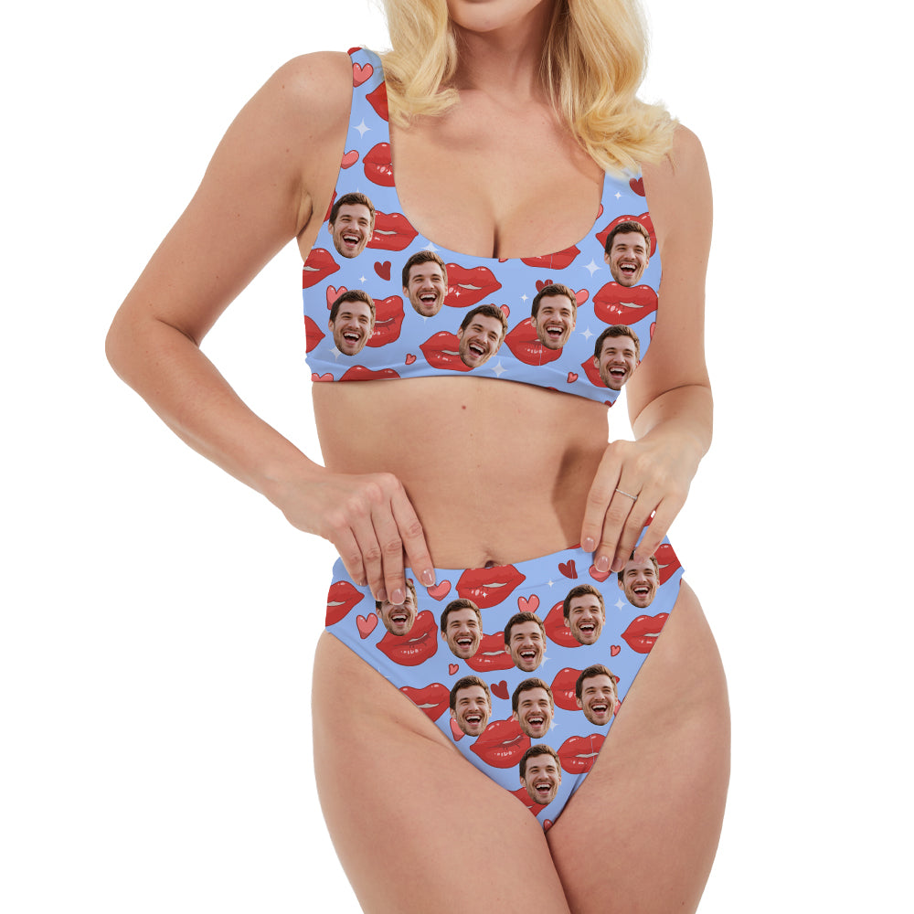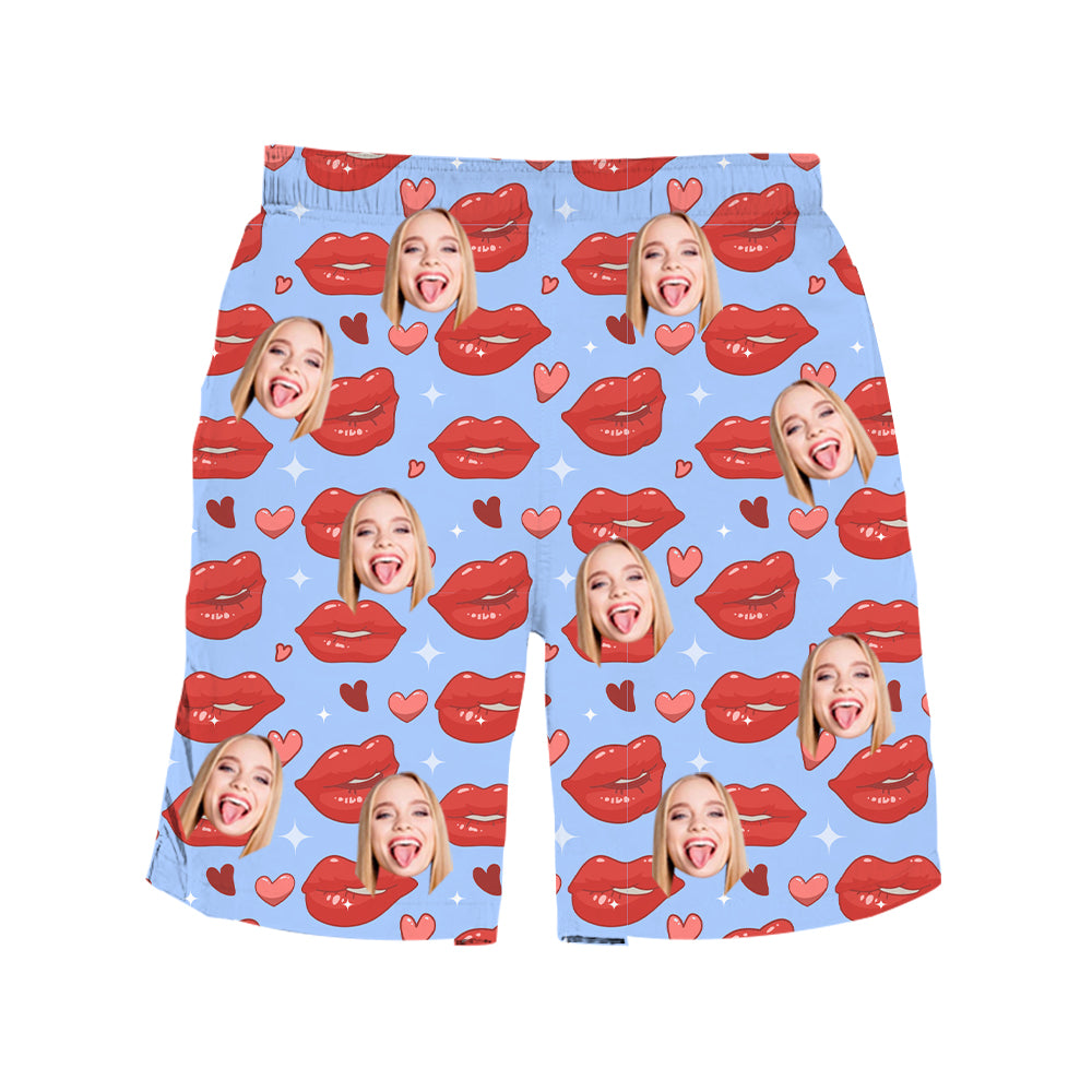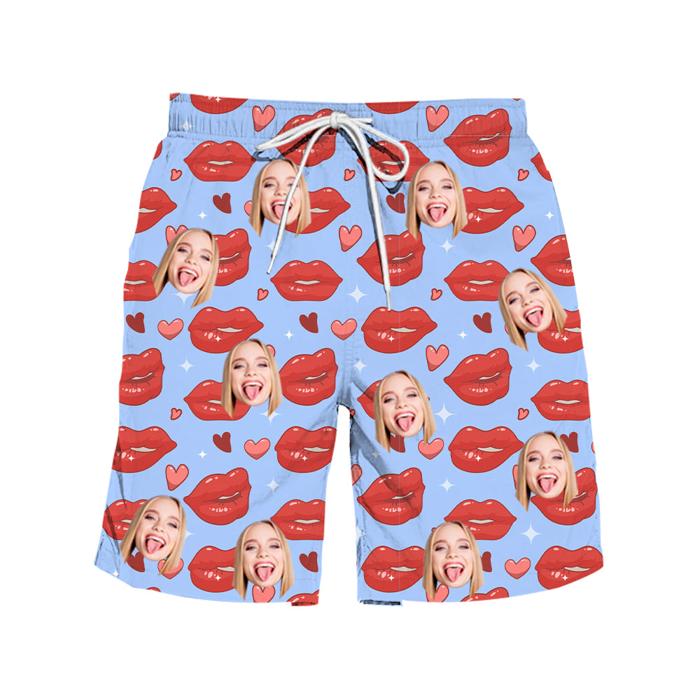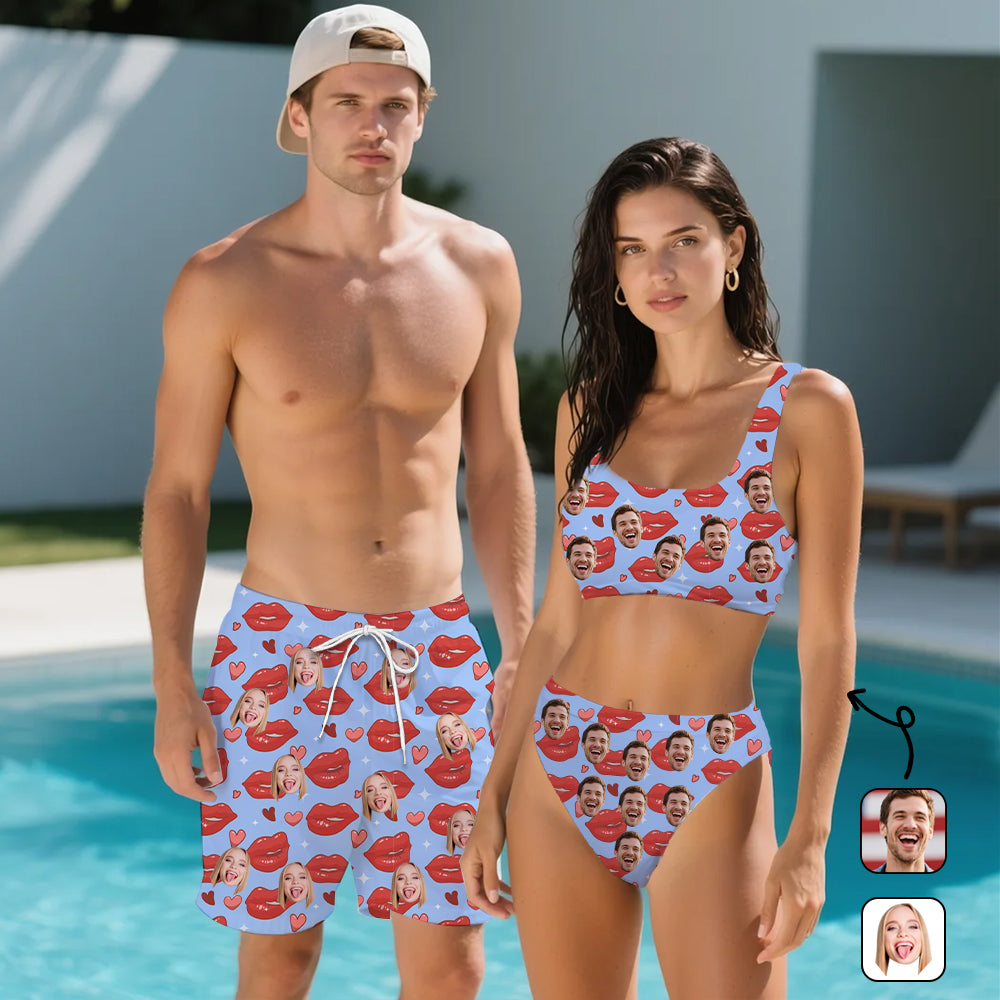 (Tax Included) Custom Face Couple's Red Lips Print Swimwear & Beach Shorts For Romantic Pool Parties