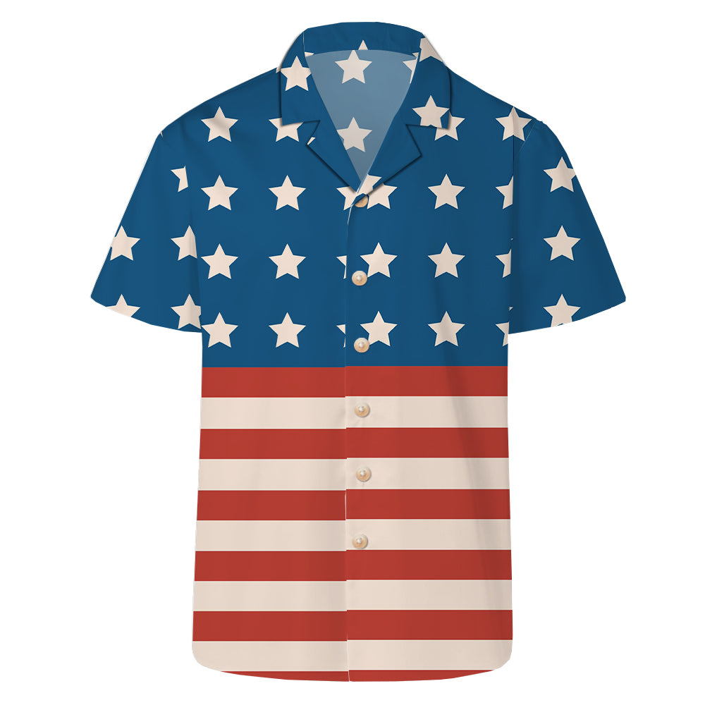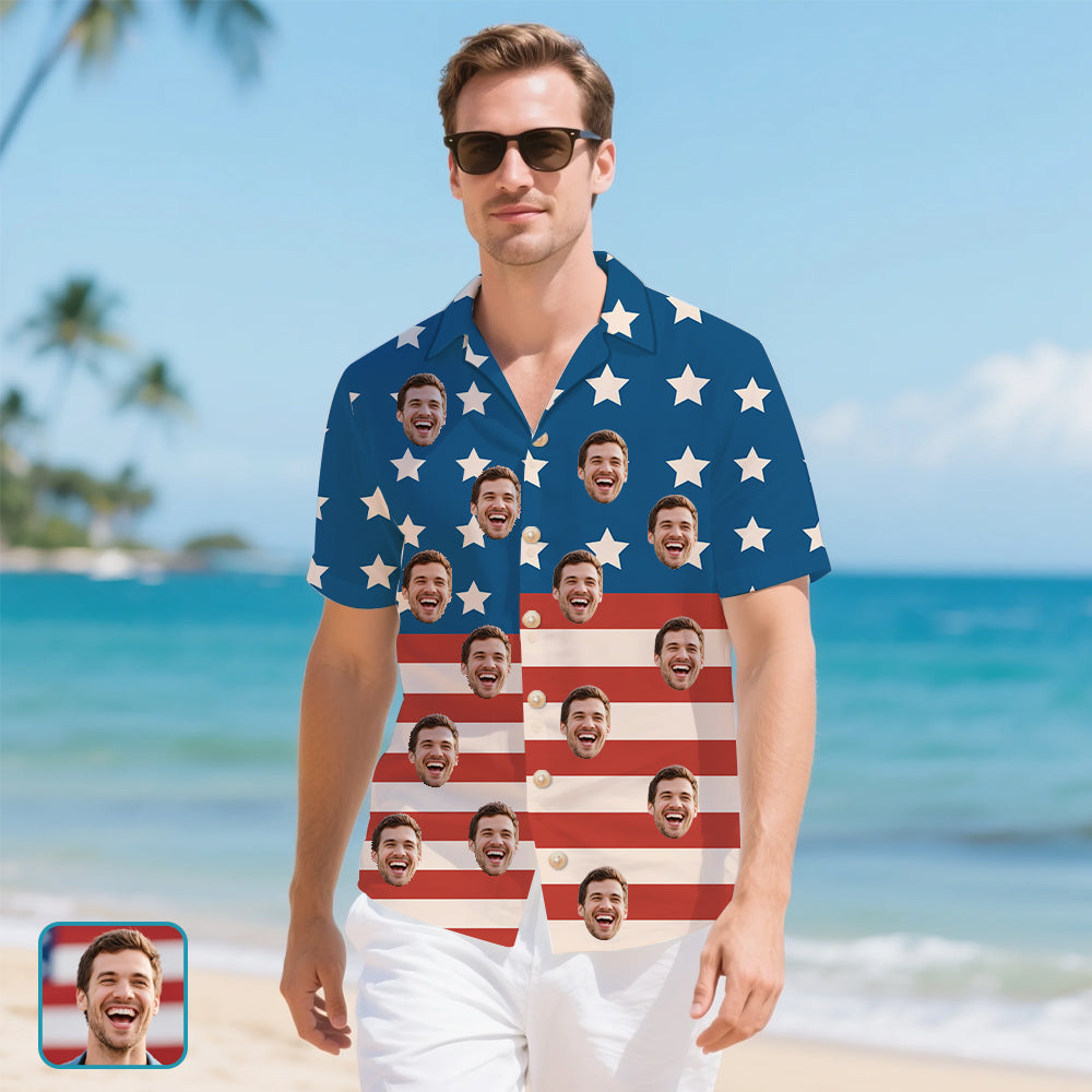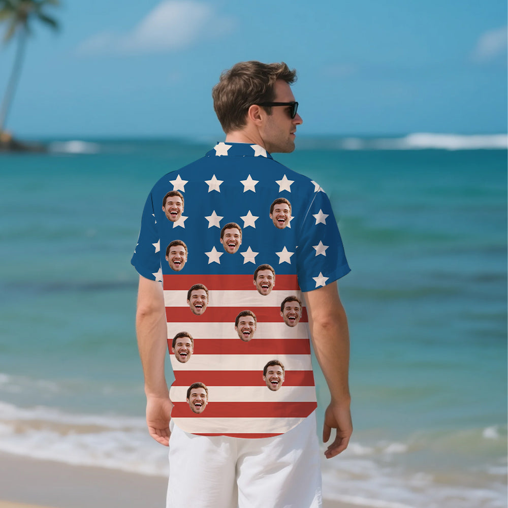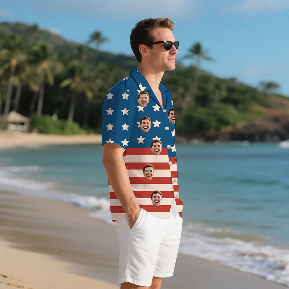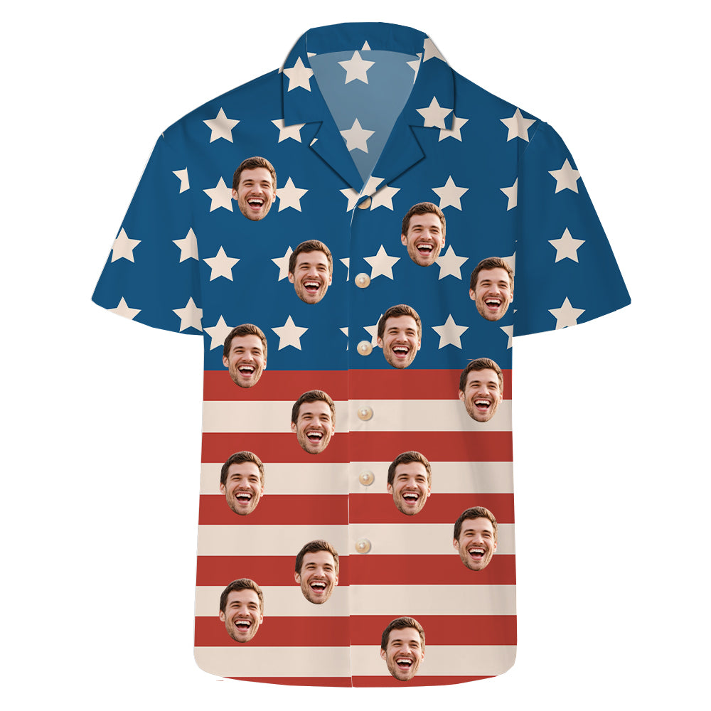 (Tax Included) Custom Face Navy Blue Star Patchwork Shirt - Patriotic Portrait Design