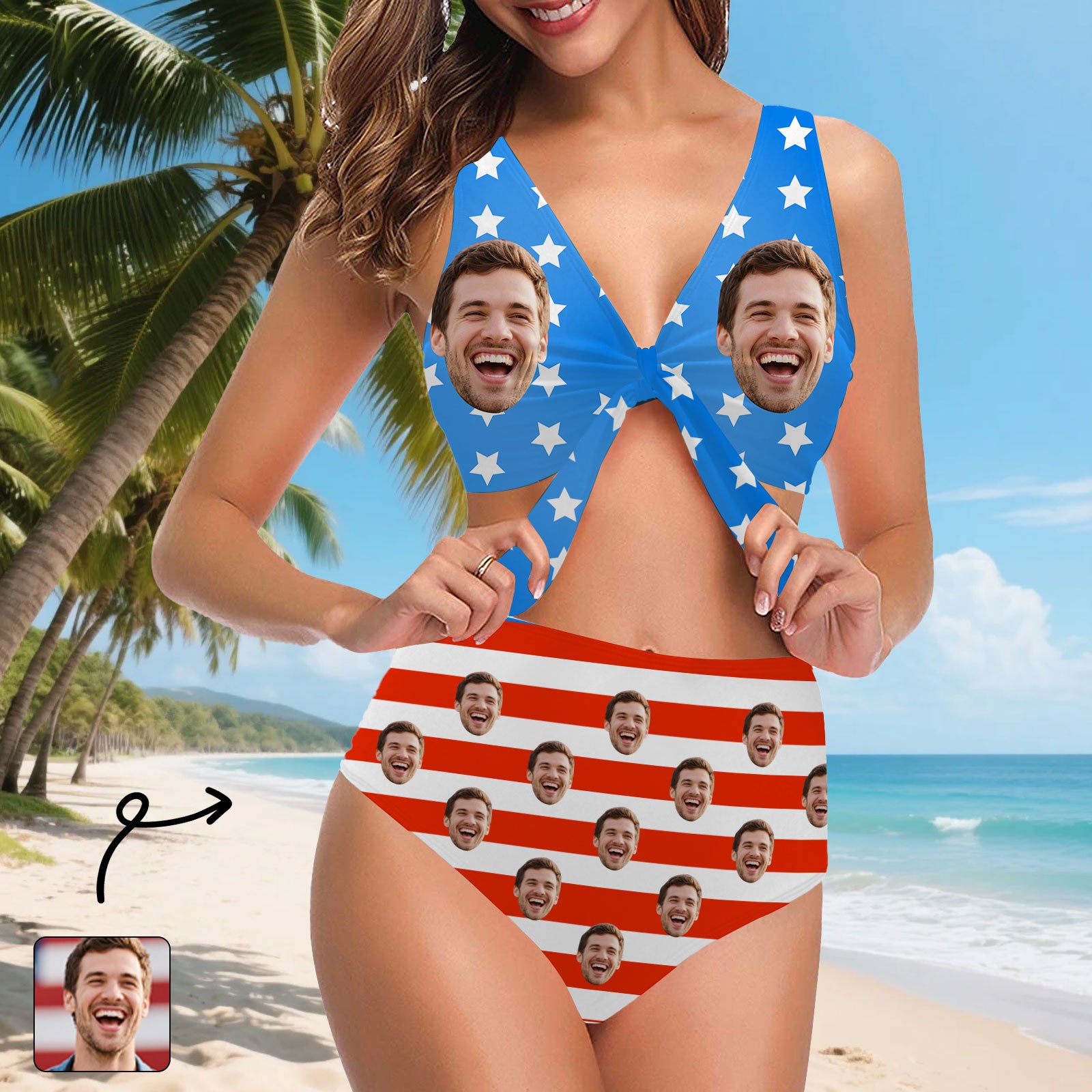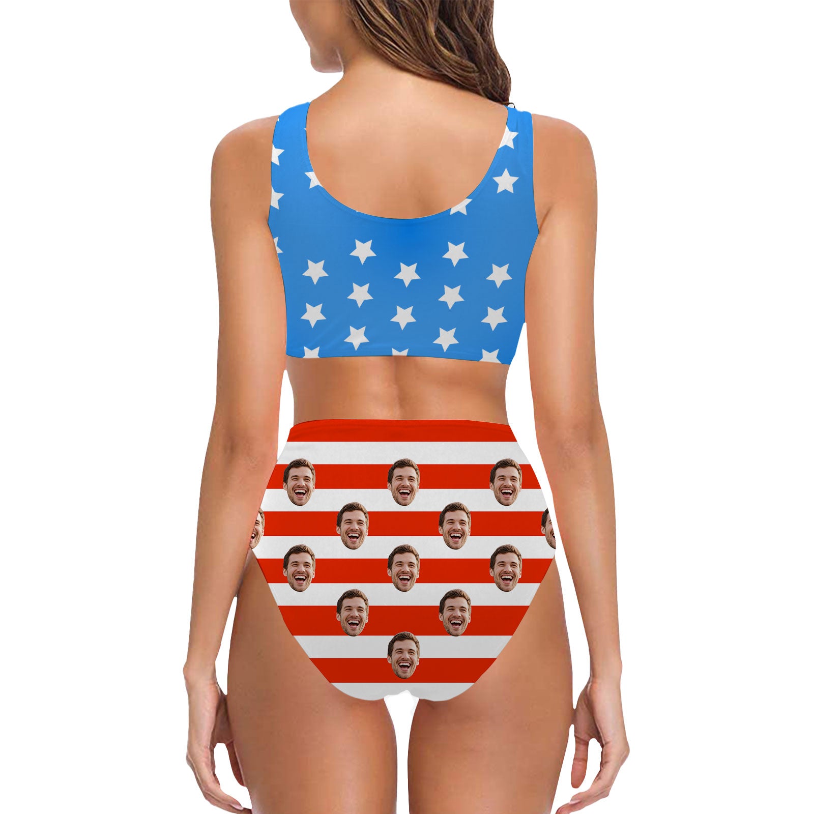 (Tax Included) Custom Face Navy Star Swimsuit - Bold Red Stripe Portrait Look