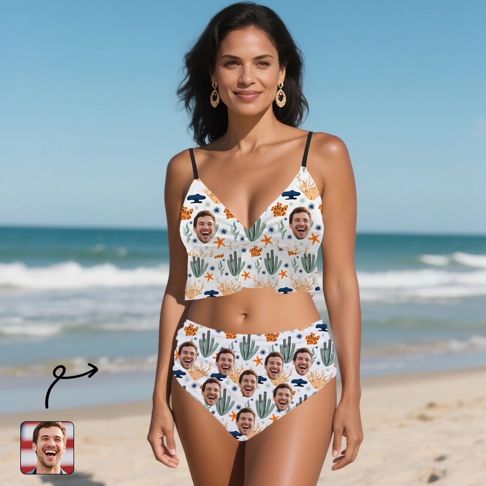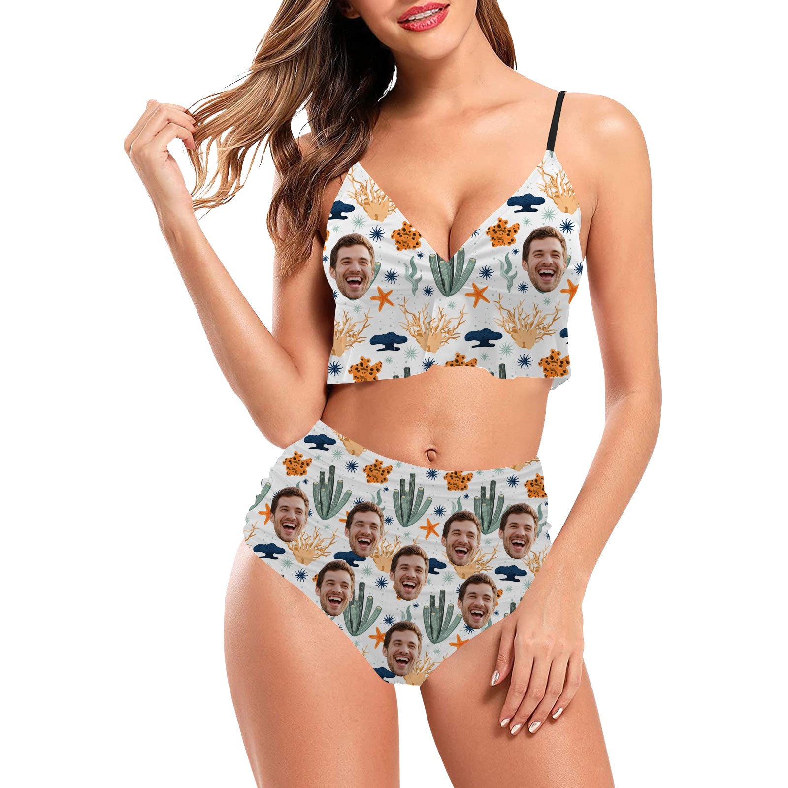 (Tax Included) Custom Face Personalized Bikini With Underwater Plants Print For Summer Vacations & Pool Parties