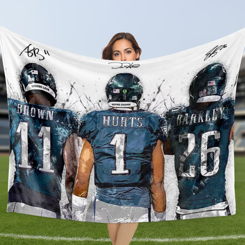 Football Blanket Saquon Barkley, Jalen Hurts, AJ Brown Philadelphia Eagles Star Player Signature Sherpa Blanket Gift for The Birds Friend