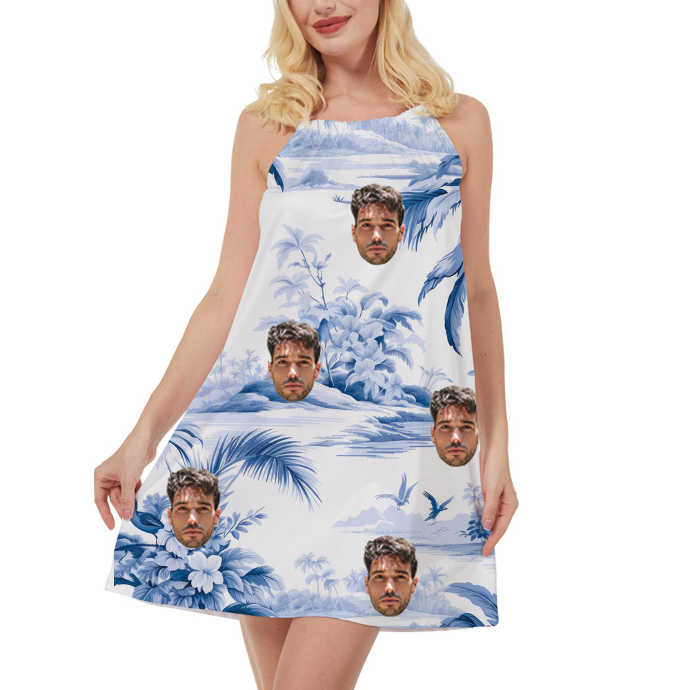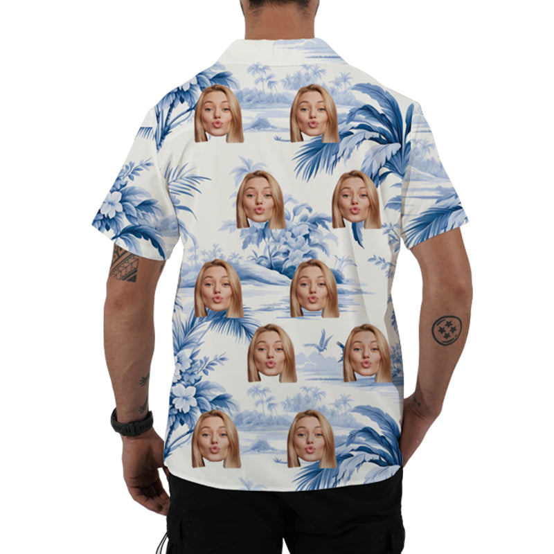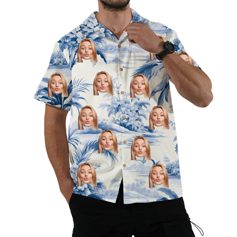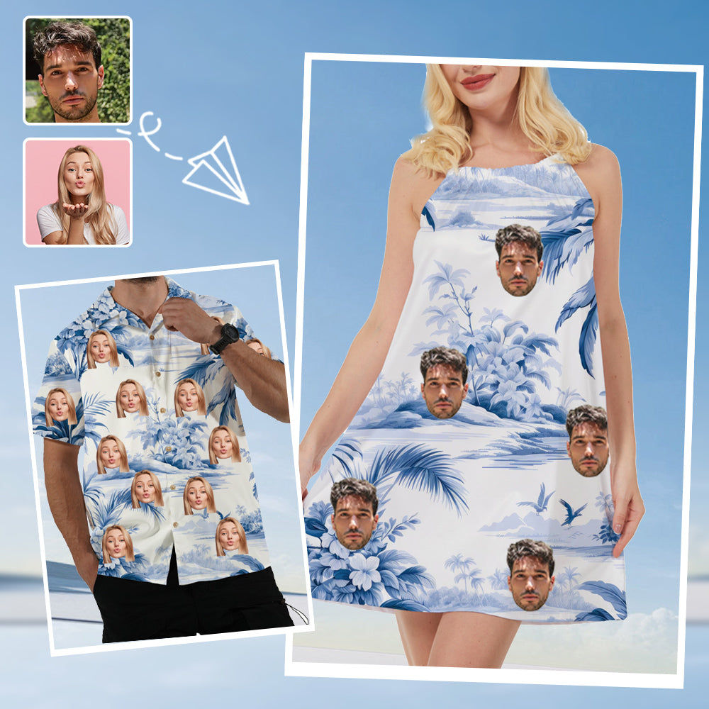 Blue and White Men's Shirts & Women's Dresses Suits Upload Photos Customized Couple Outfits Summer Outerwear