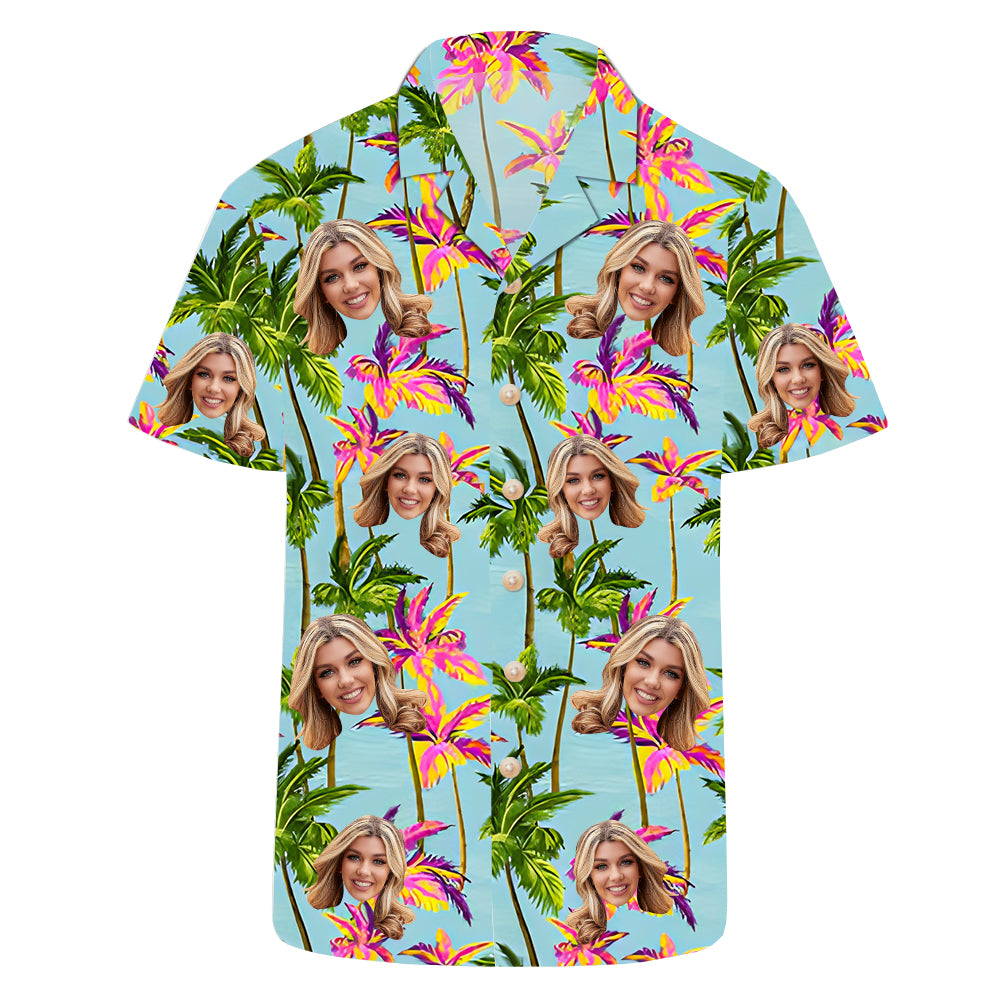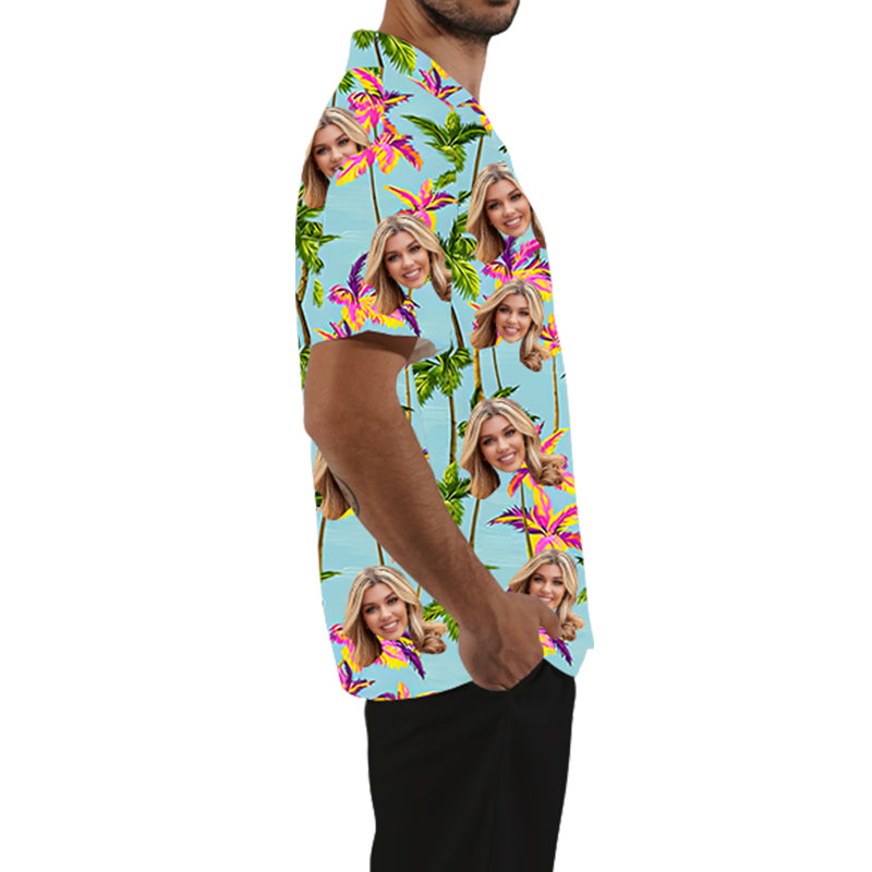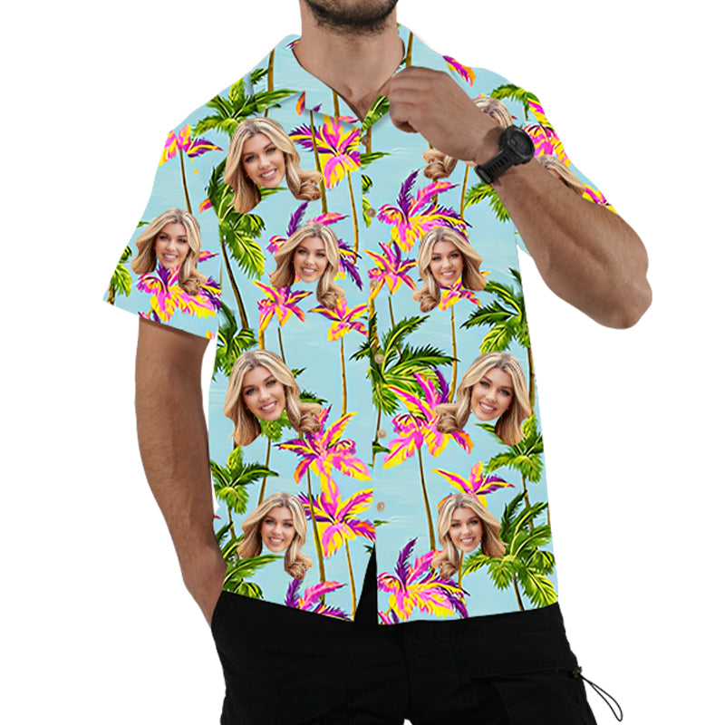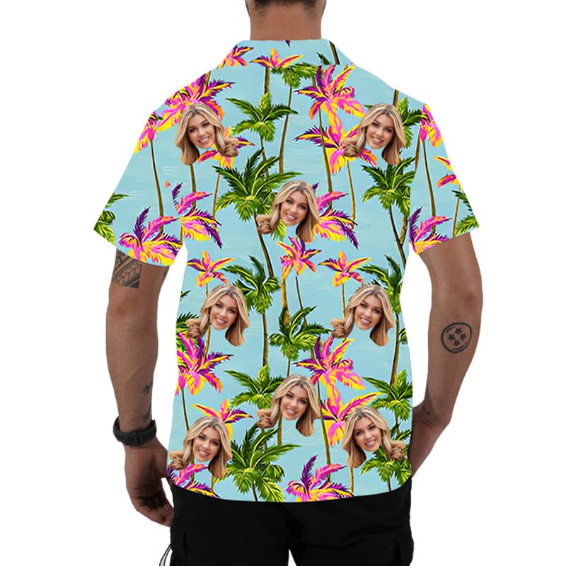 Custom Face Hawaiian Shirt with Vibrant Palm Tree Design Personalized Tropical Man’s Aloha Shirt Vacation Outfit