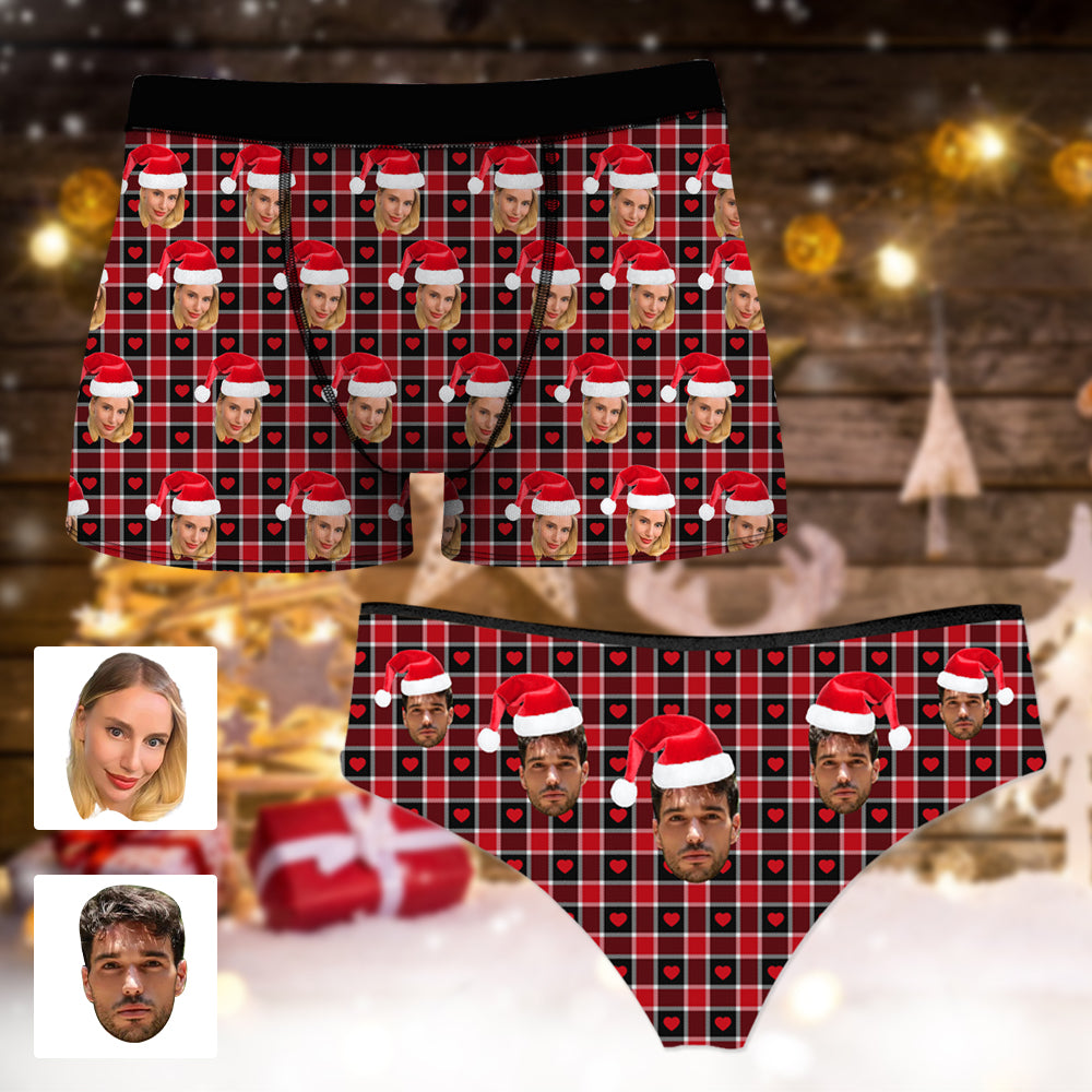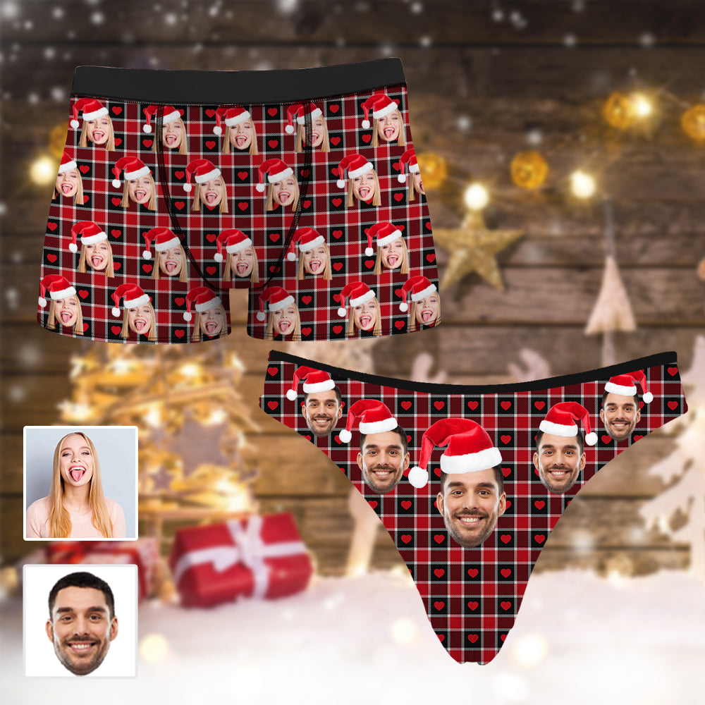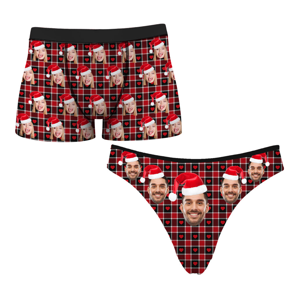 Red Plaid Boxer & Thong Couple Underwear Set Customized Face Christmas Gift