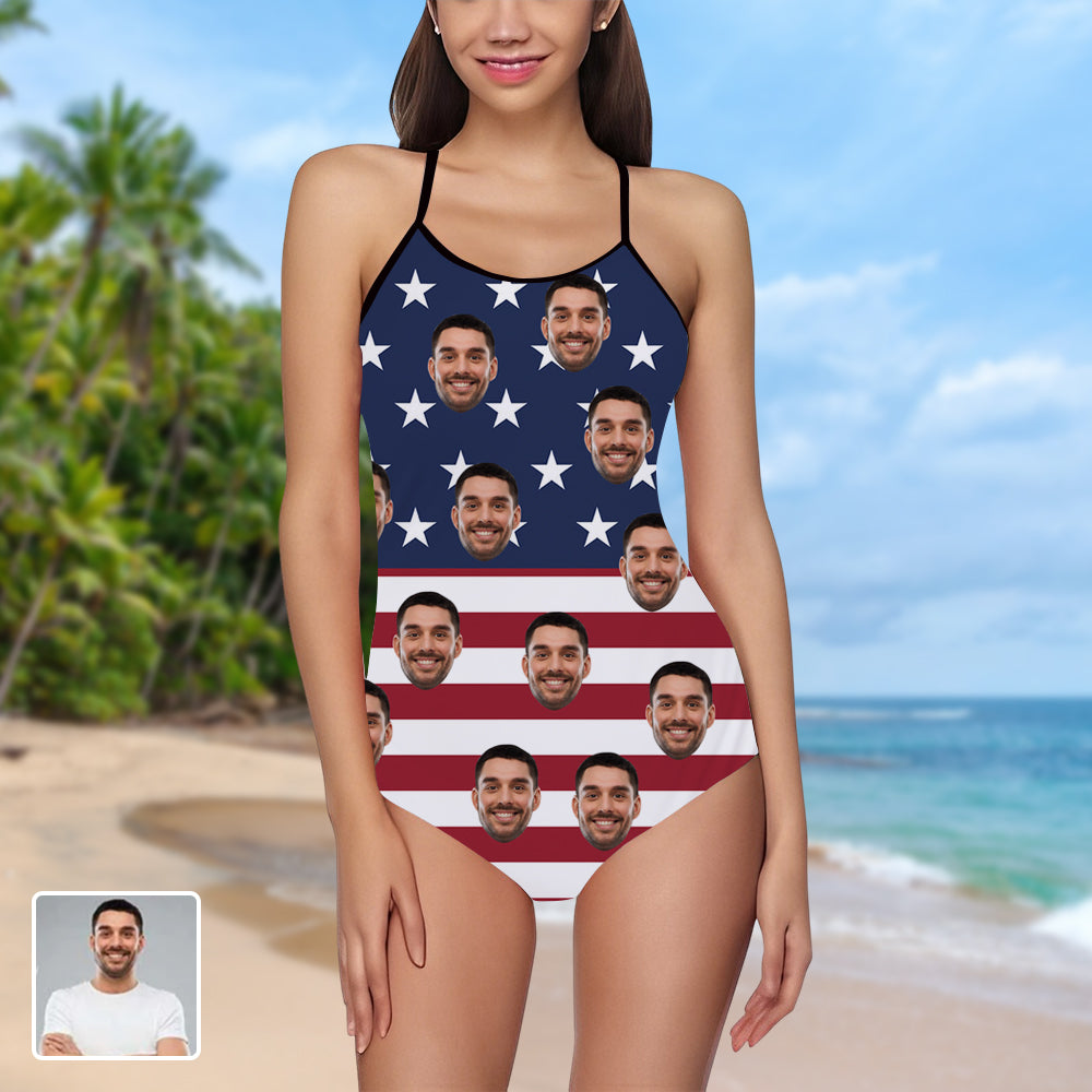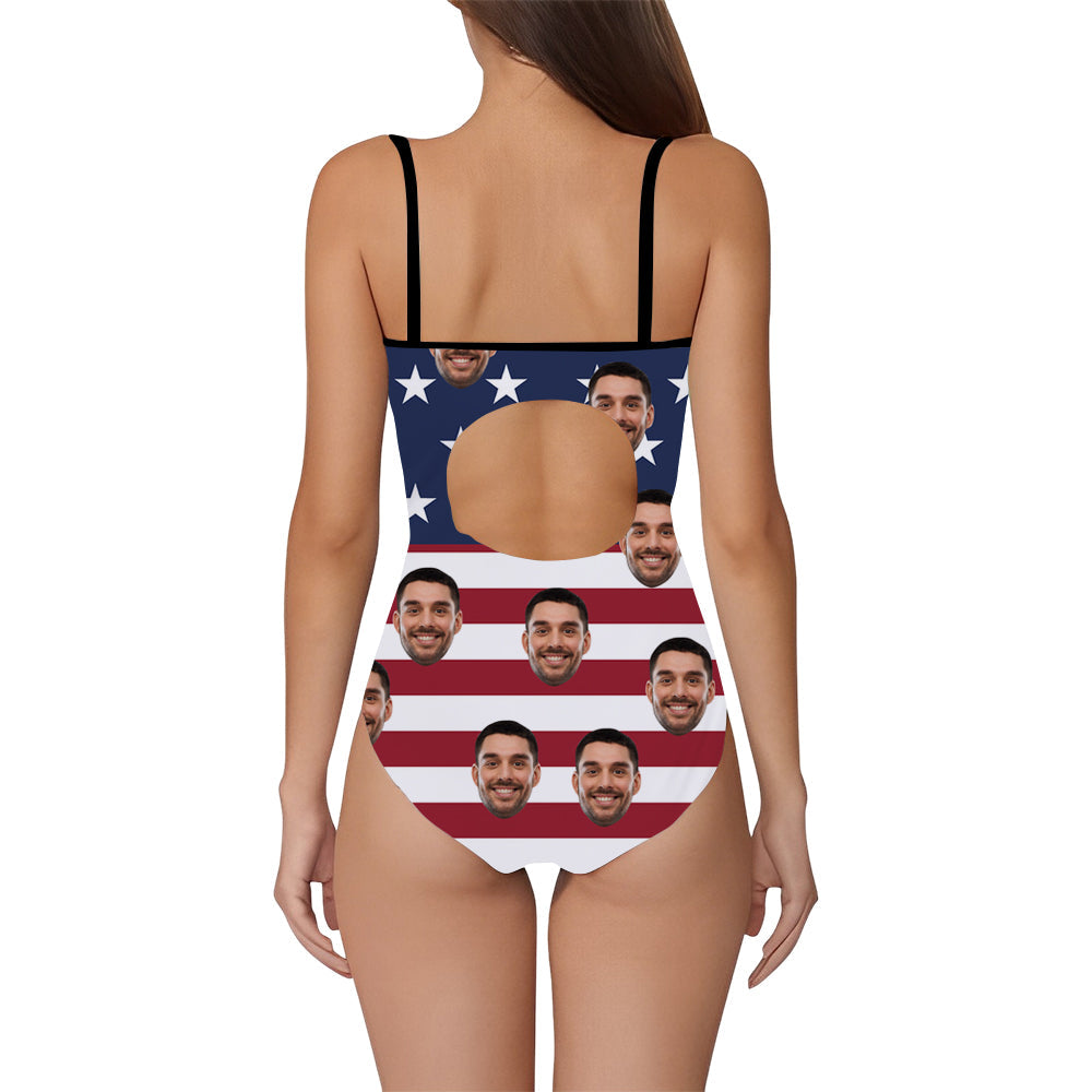 (Tax Included) New Back Cutout American Flag Printed Face Custom Swimsuit Independence Day