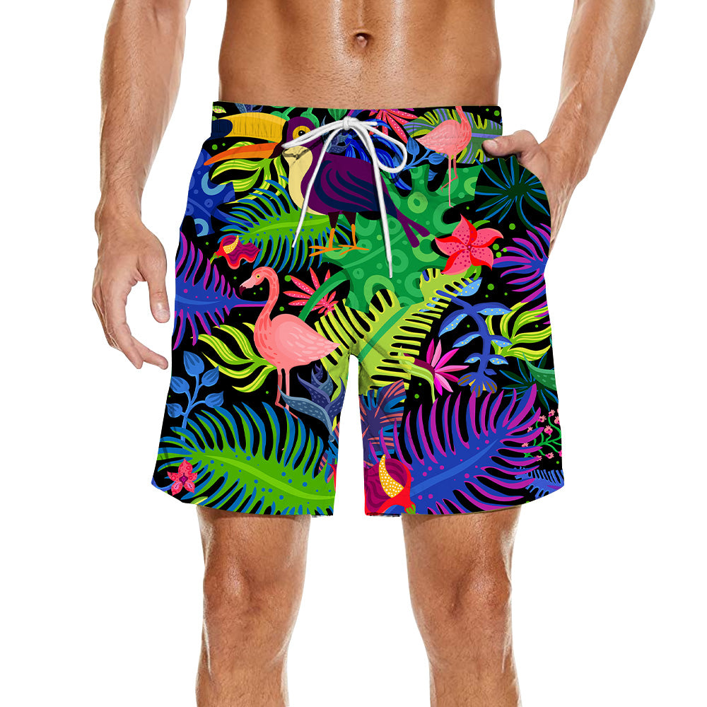 (Tax Included) Palm Leaf And Flamingo Print Beach Shorts Customizable Face Shape Perfect For Parties And Vacations