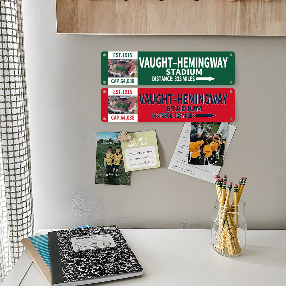 Our custom football stadium street sign is the perfect item to show your passion for your favorite team! This unique sign features a high-quality image of your chosen football field, complete with the year it was built and its seating capacity. You can even customize the mileage with the distance from any location to the stadium, adding a personal touch to your display.