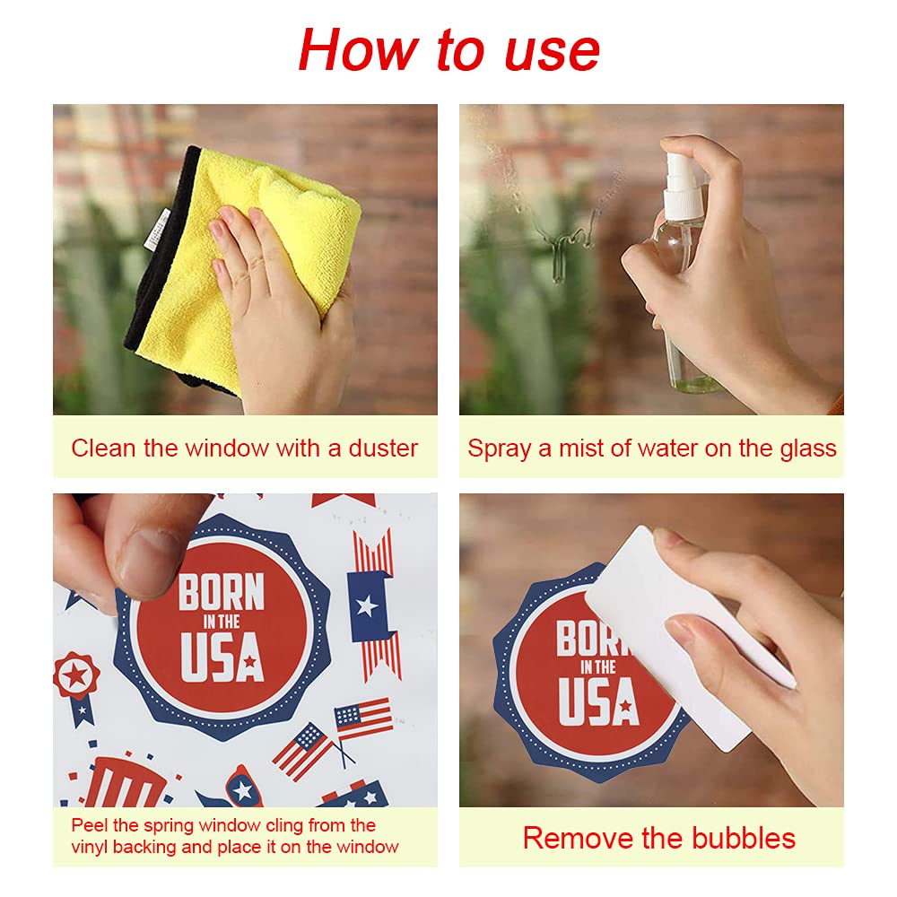 - Easy to Use: This kind of Fourth of July sticker stamp removable clings are used with no glue,just peel off the sticker and stick it on the surface like car truck glass,mirror,windows,glass storm door and bathroom; use a card to squeeze out air bubbles from top to bottom