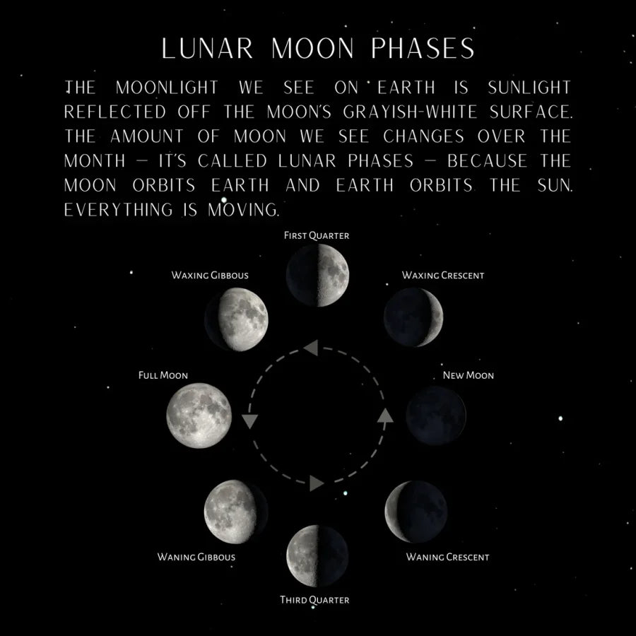 As the moon, Earth, and the sun go through their orbital dance, the part of the moon that's illuminated by sunlight moves in and out of our view, creating a predictable series of lunar phases. In any given month we see eight distinct phases of the moon, defined by how much of the lunar disk is illuminated from our perspective and whether the moon is heading toward or away from being full.