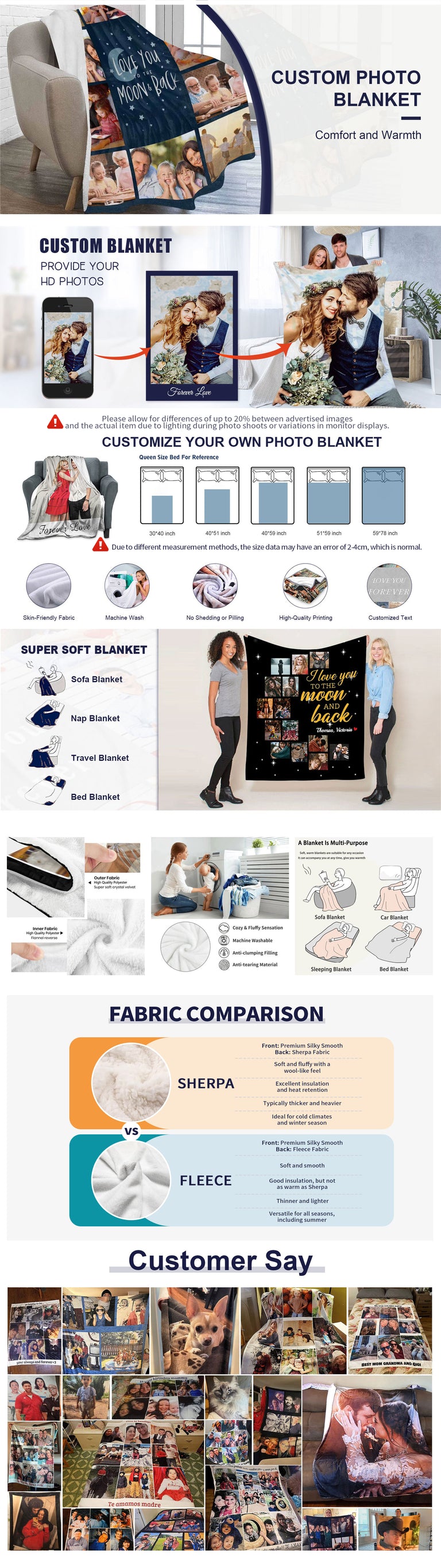 【CUSTOM BLANKET】We provide the easiest and most versatile tools to help you turn your photos into memories. You can also add photos and text to make a one-of-a-kind gift. Design and Create the perfect personalized Blanket is fast, easy and fun.We are one of the leading sellers of photo blankets worldwide.