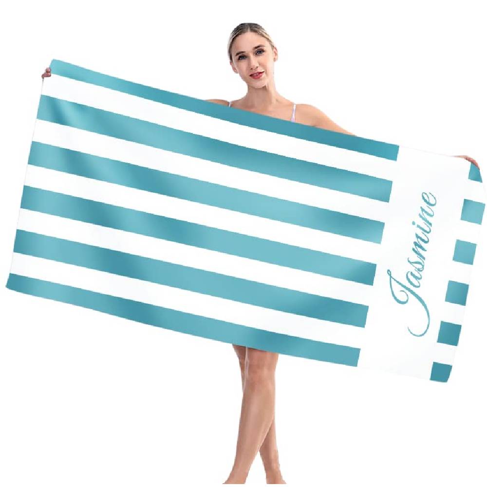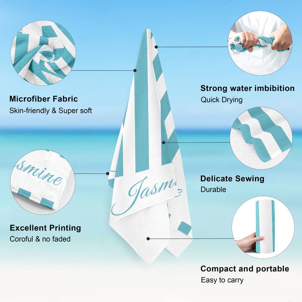 - [ SUPER ABSORBENT & QUICK DRYING] Personalized beach towels are made of microfiber fabric which is comfortable, breathable, skin-friendly and soft touch. The strong water absorption allows your travel towel to quickly absorb water from your body after swimming or bathing and quickly absorb sweat after exercise. Each towel is made to dry quickly and easily, saving you a soggy backpack and saving the tumble dryer.