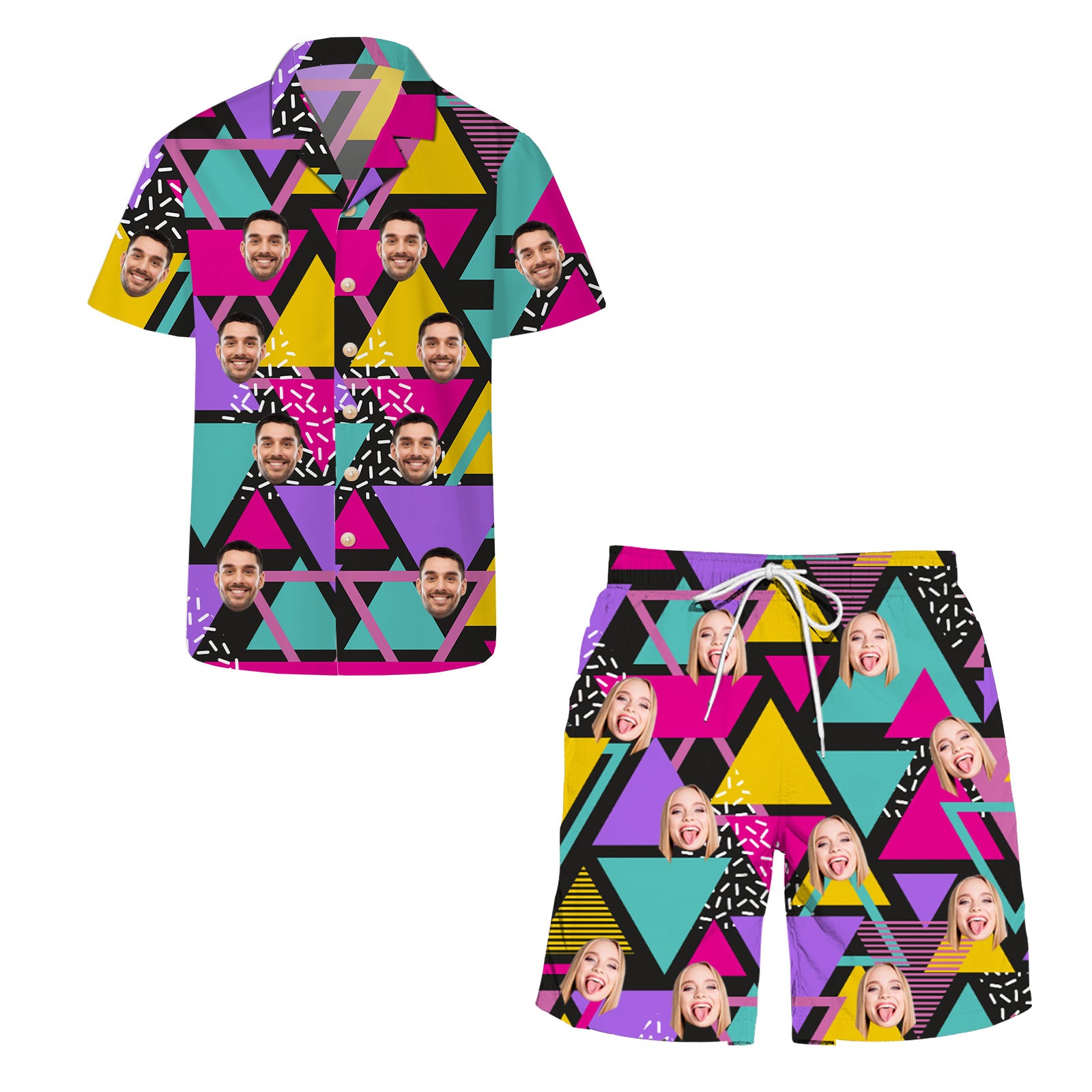 (Tax Included) 2 Pieces Men's Beach Suit Geometric Pattern V Neck Shirt & Shorts Party Vacation Customized Face