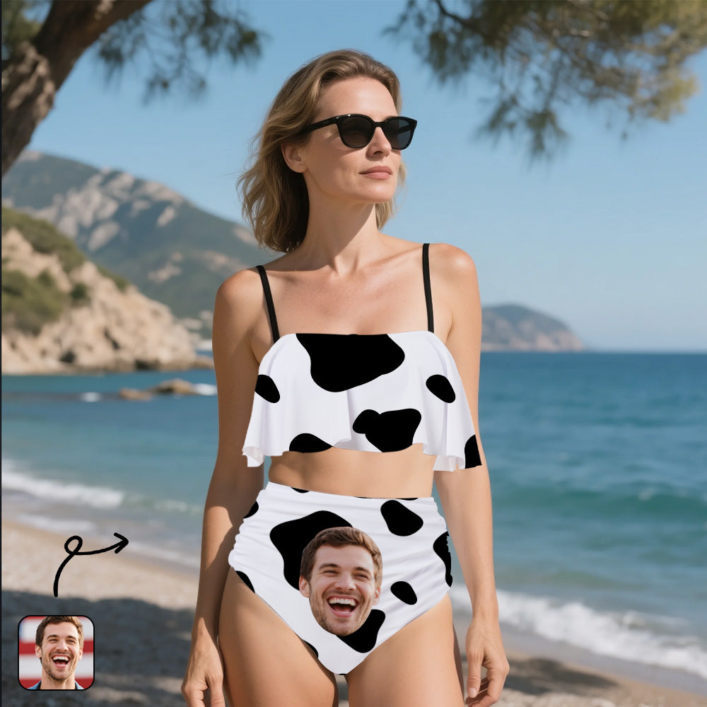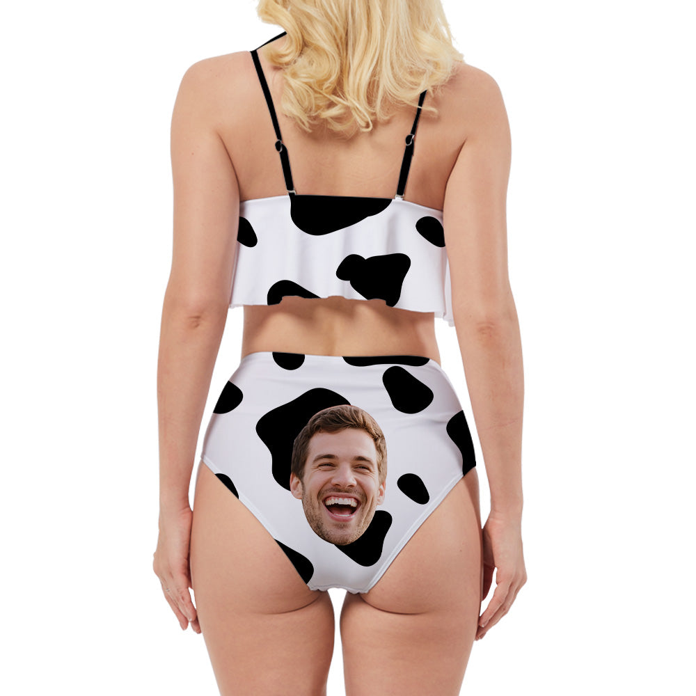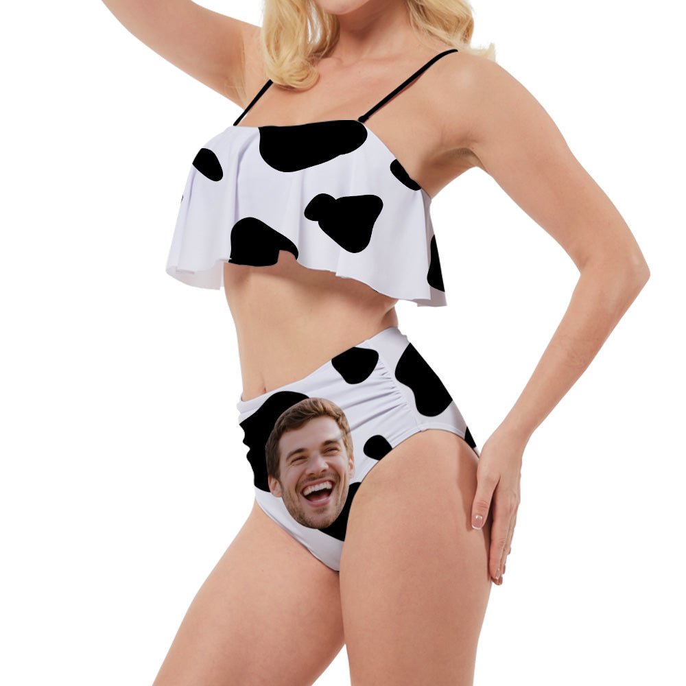 (Tax Included) Cow Print Ruffled Bikini Set With Customizable Face