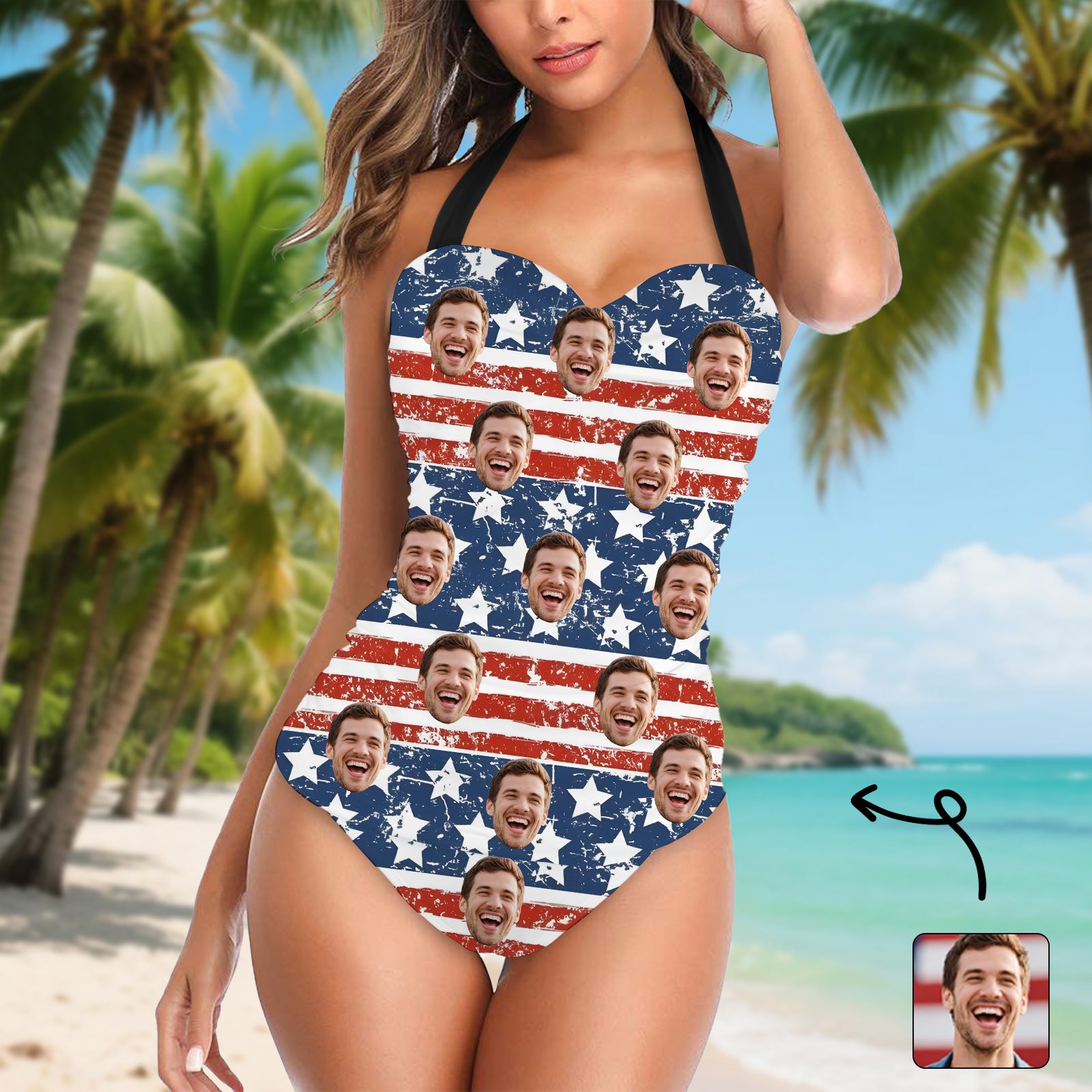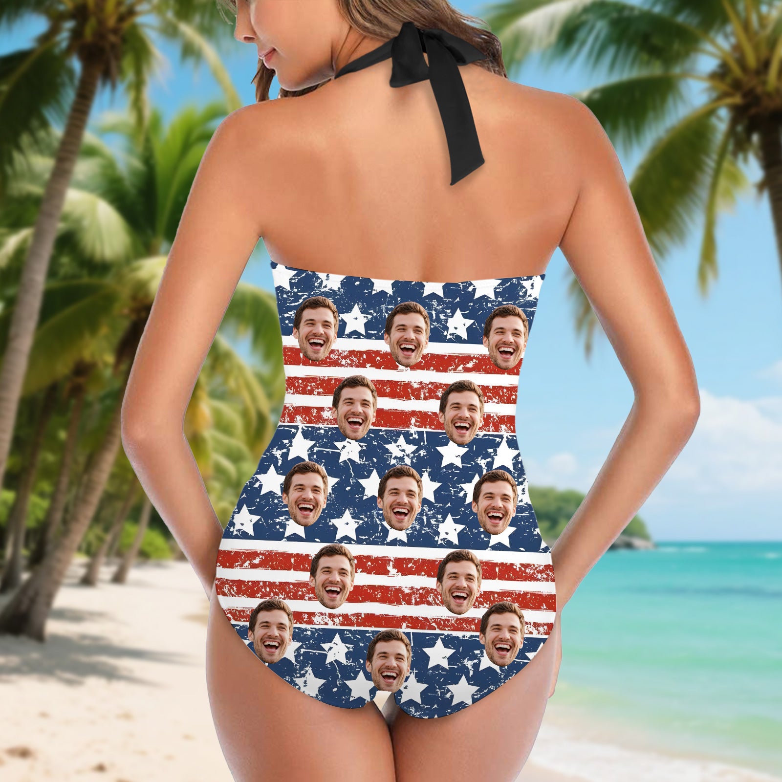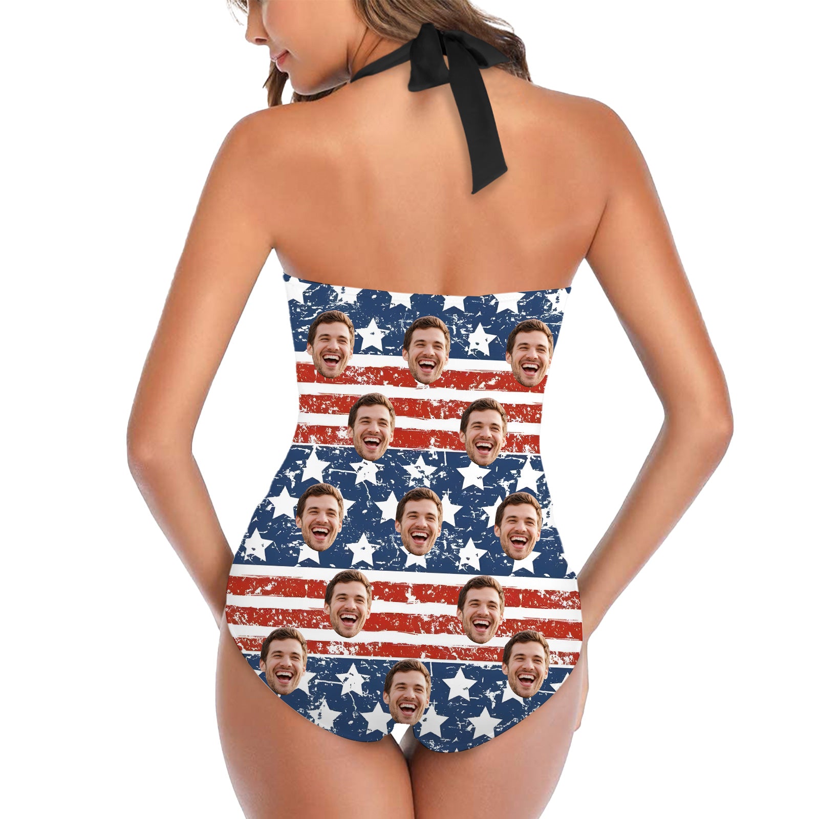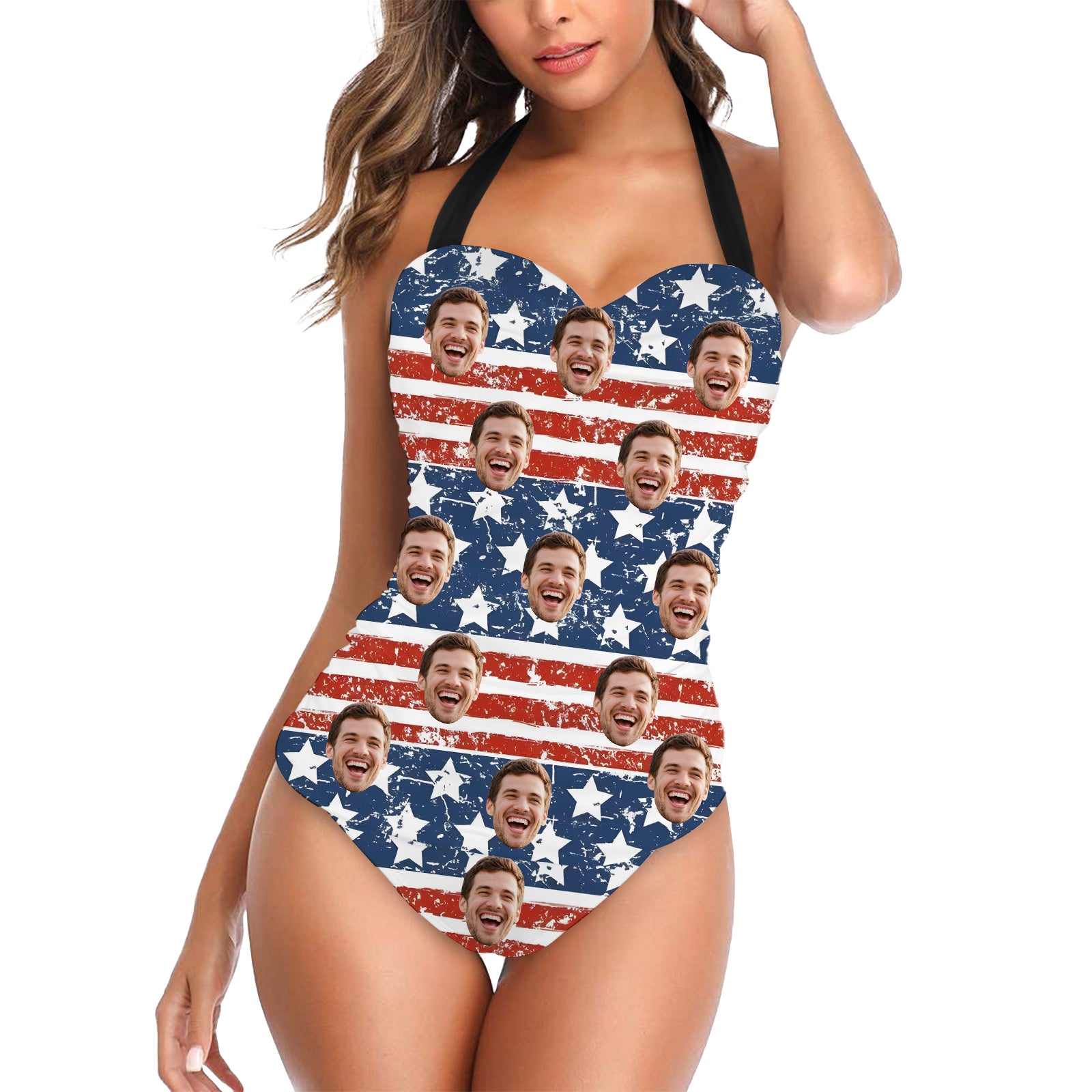 (Tax Included) Custom Face Navy Blue Star Pattern Swimsuit For July 4th