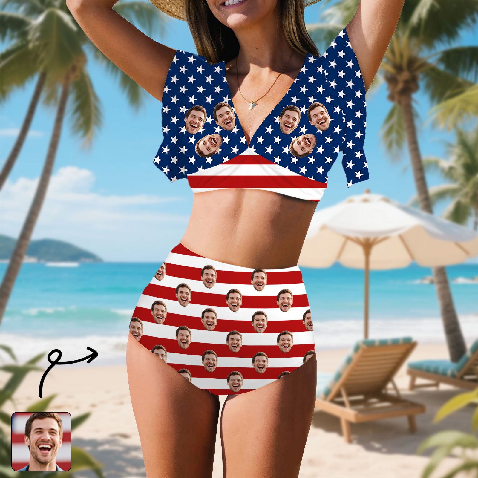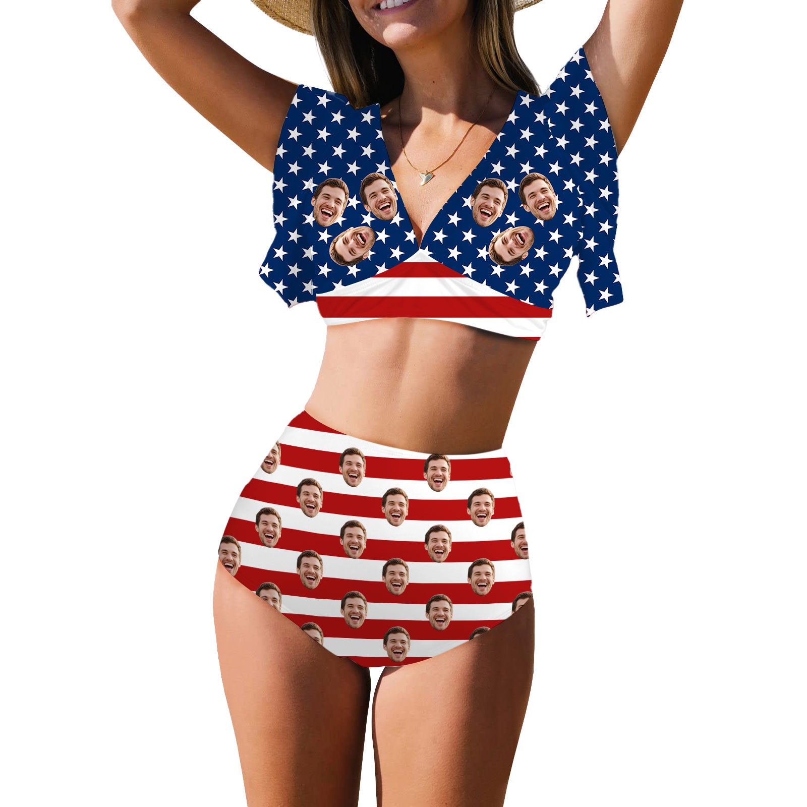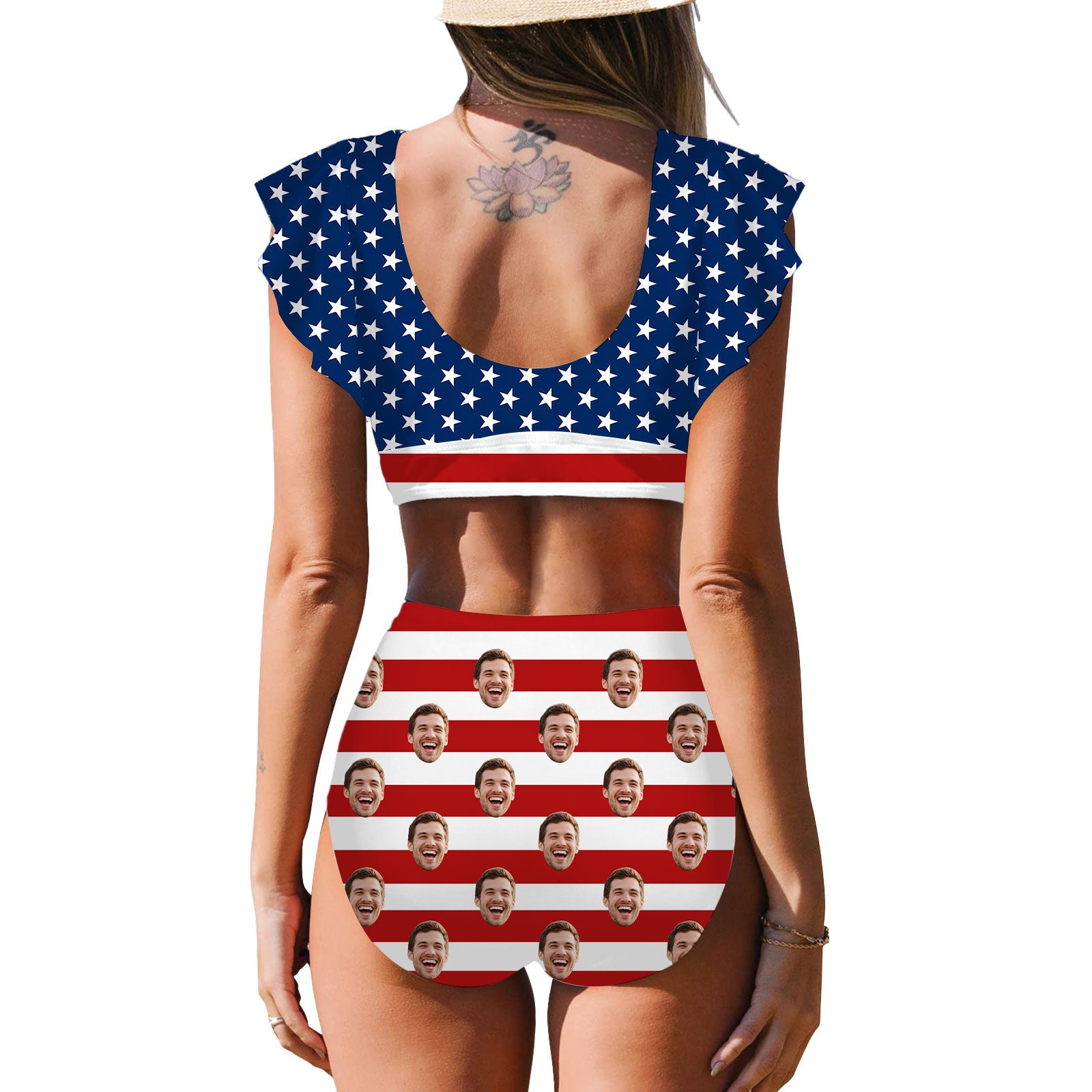 (Tax Included) Custom Face Navy Striped Bikini - White Star Portrait Design