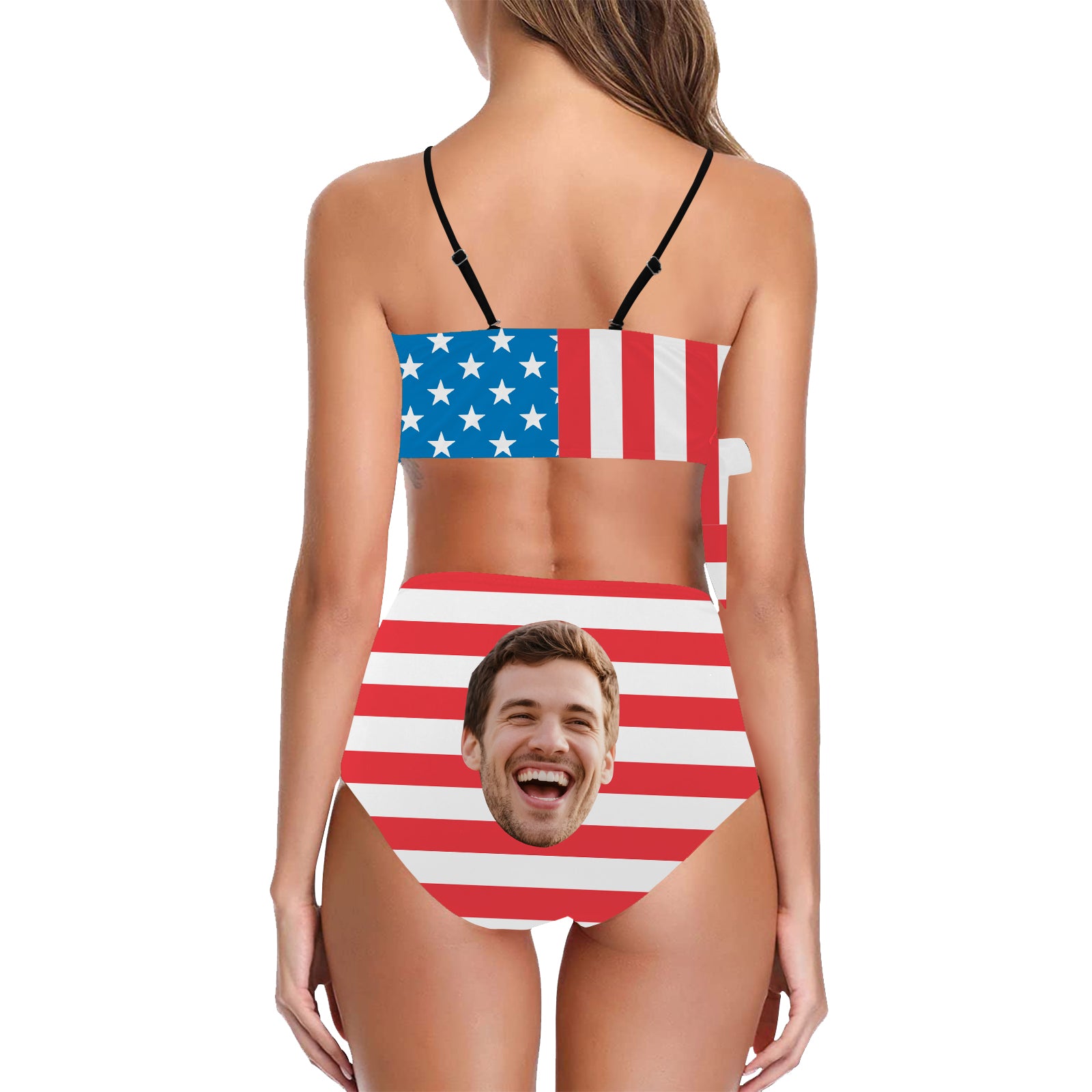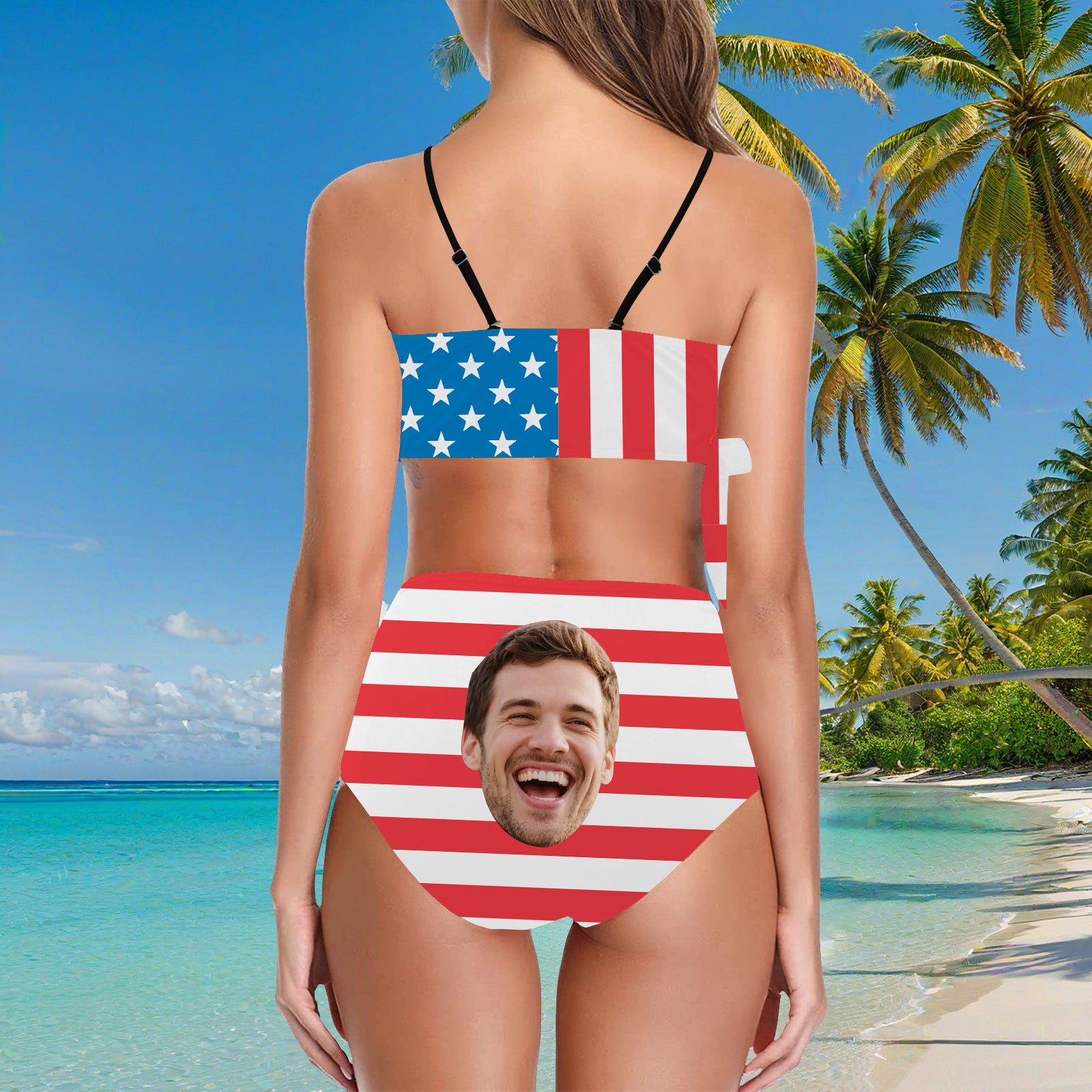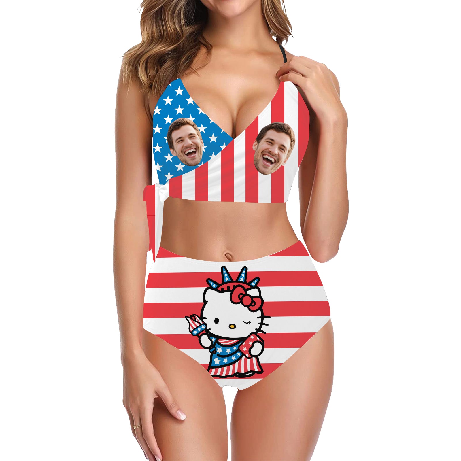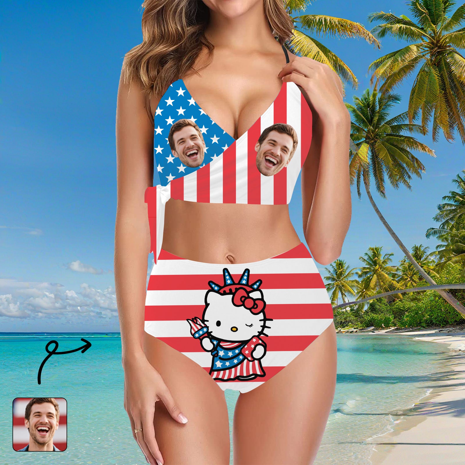 (Tax Included) Custom Face Playful Cartoon Cat Patriotic Themed Swim Set For Summer Beach Fun