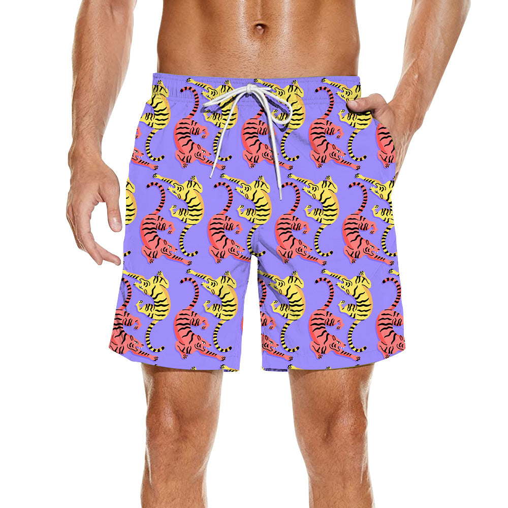 (Tax Included) Custom Face Purple Tiger Emoji Beach Shorts - Fierce Yet Fun Vacation Wear