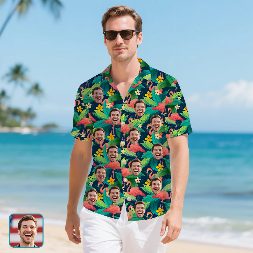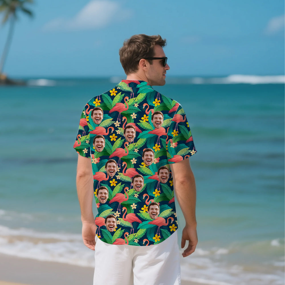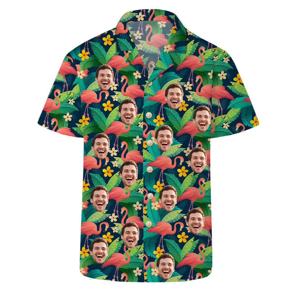 (Tax Included) Green Hawaiian Shirt with Flamingos & Yellow Flowers: Custom Face for Tropical Fun