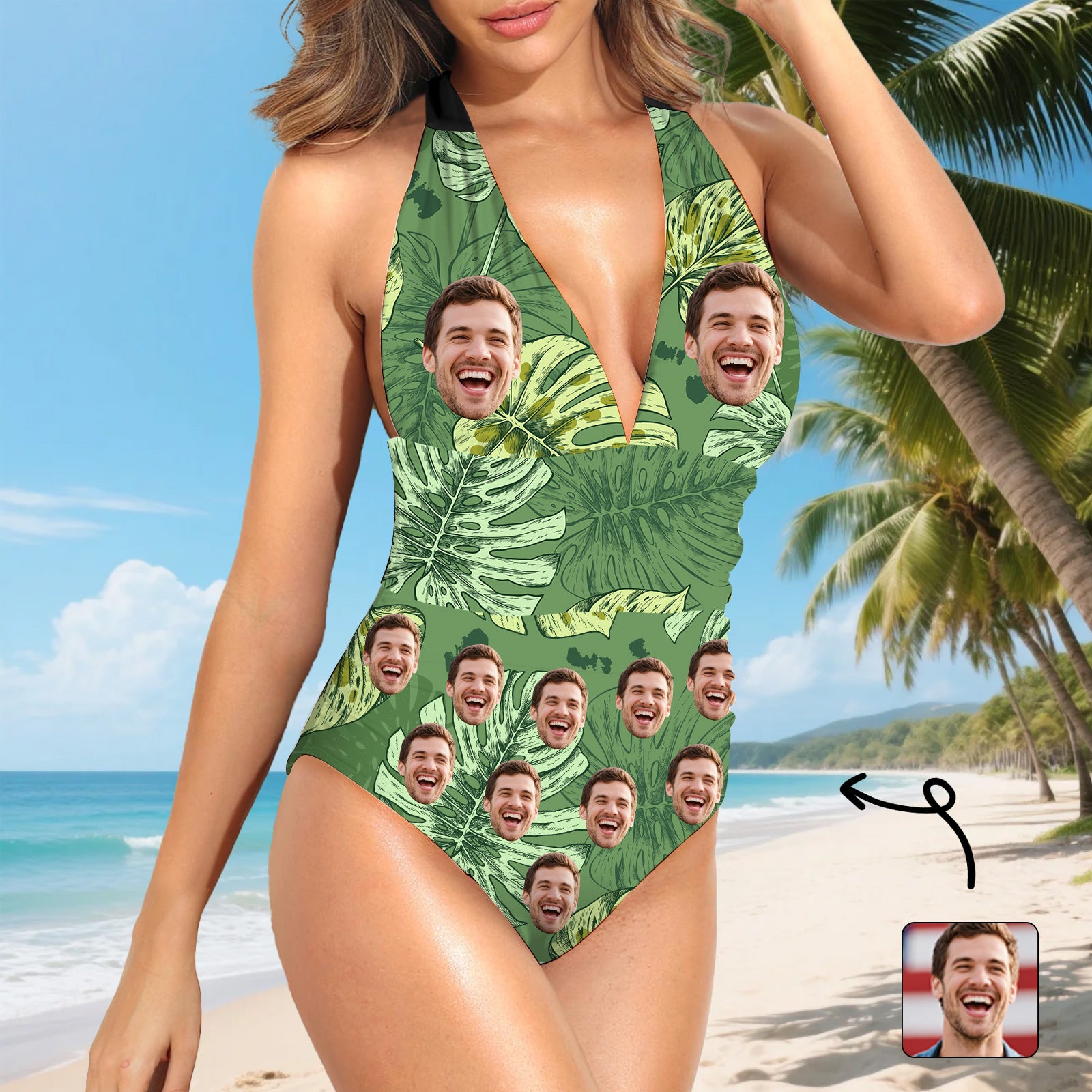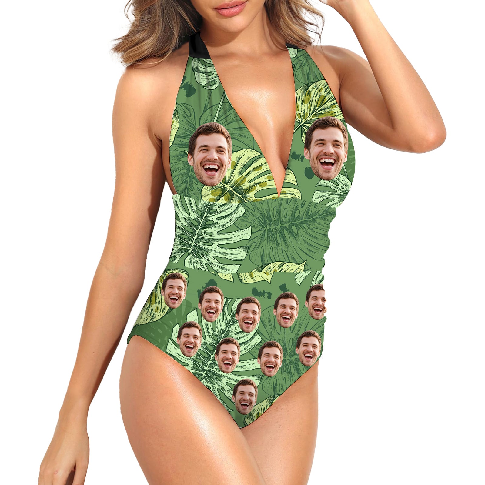 (Tax Included) Nature Inspired Green Monstera Leaf Swimsuit With Custom Face Portrait