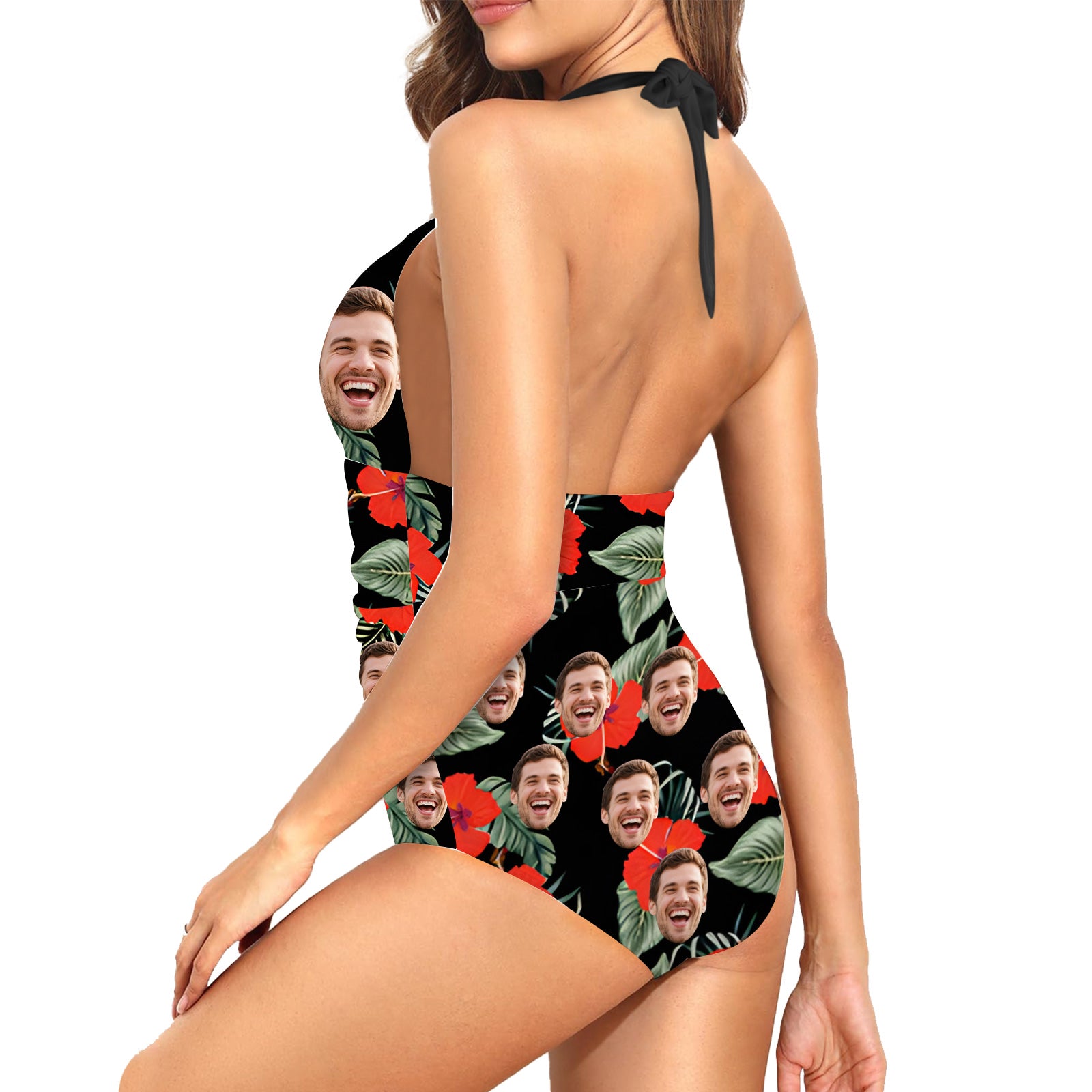 (Tax Included) Retro Black Swimsuit With Red Flowers & Custom Face Feature
